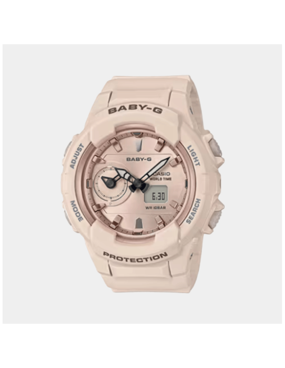 This Baby-G BGA-230S-4ADR watch features:, Resin Band Material, Resin Case Material, Analog-Digital Display, 100M Water Resistance, Mineral Glass, Alarm clock, World time, Hand Shift Feature, Tachymeter, Dual time, Neobrite Hands,
