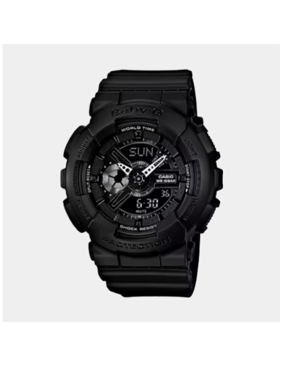 This Baby-G BA-110BC-1ADR watch features:, Resin Band Material, Resin Case Material, Analog-Digital Display, 100M Water Resistance, Mineral Glass, Alarm clock, World time, Dual time,