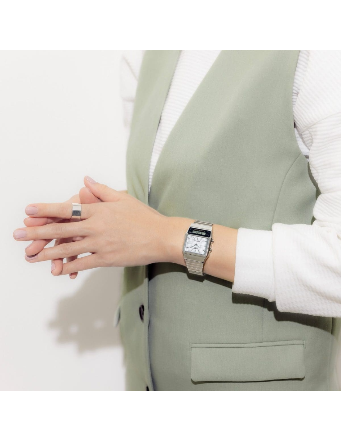The Casio AQ‑800E‑7A2DF is a retro-modern analog-digital watch from Casio’s Vintage Collection (module D363). It features a slim rectangular stainless steel case and bracelet, with an analog dial for hours/minutes and a separate digital LCD panel for additional timekeeping. Marketed as unisex, it’s lightweight and suits both men and women who favor vintage aesthetics with practical digital functionality.