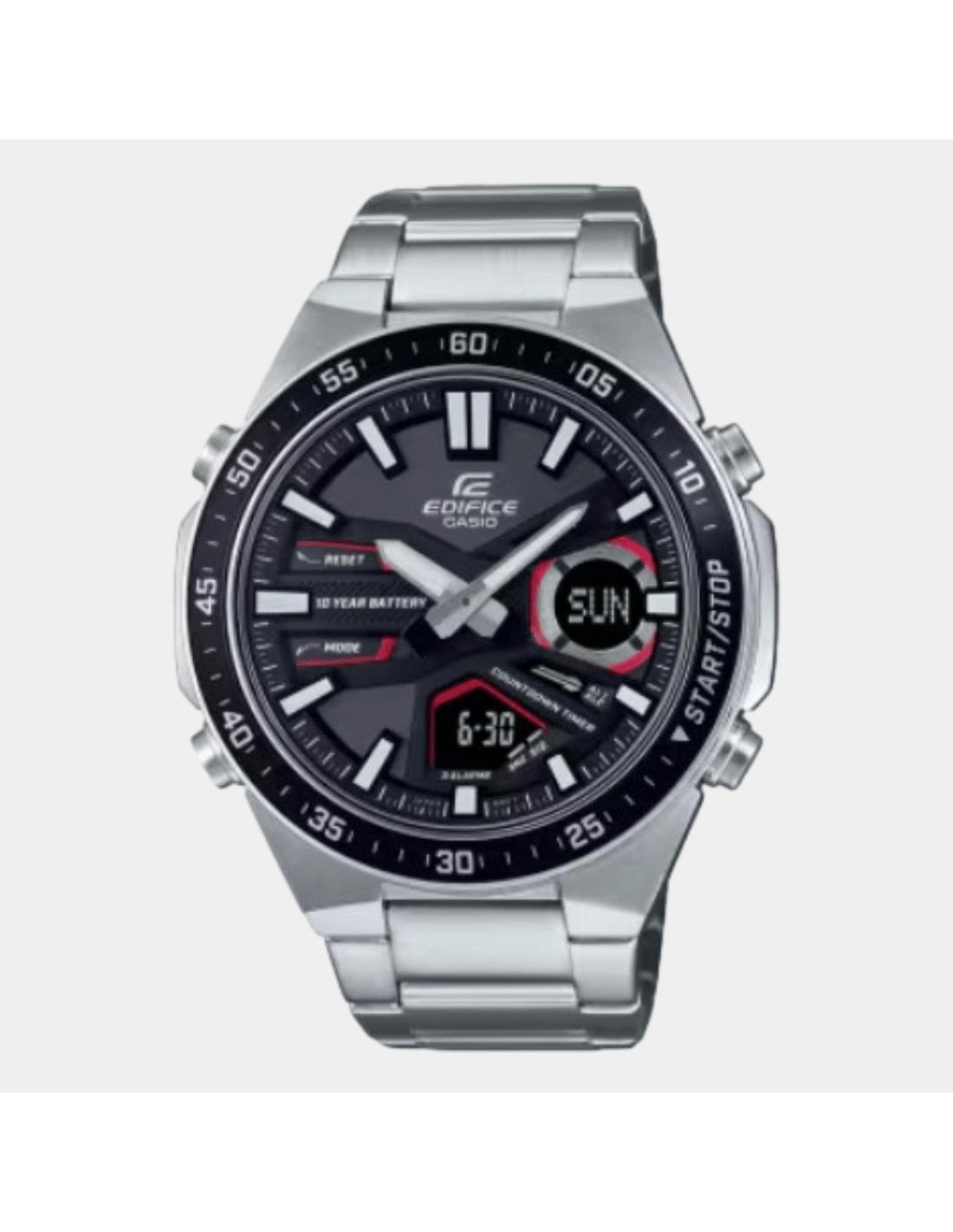 This Edifice EFV-C110D-1A4VDF watch features:, Stainless Steel Band Material, Stainless Steel Case Material, Analog-Digital Display, 100M Water Resistance, Mineral Glass, Chronograph, Alarm clock, Stop Watch, World time,