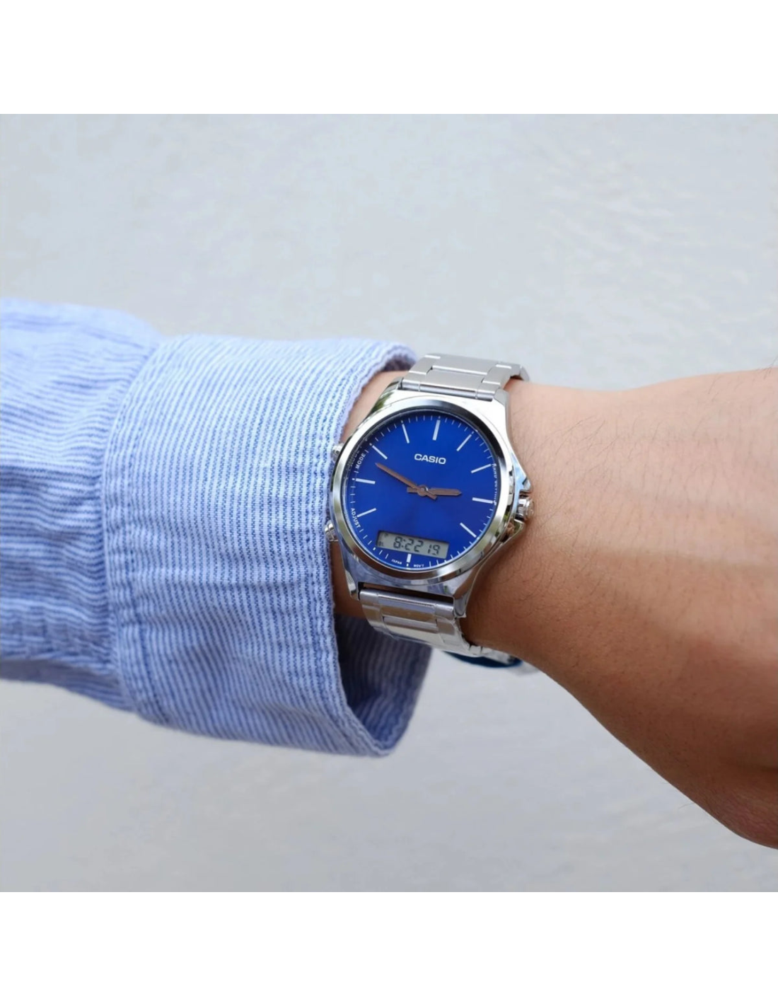 This Casio Men MTP-VC01D-2EUDF watch features:, Stainless Steel Band Material, Stainless Steel Case Material, Analog-Digital Display, Water Resistant Water Resistance, Mineral Glass, Chronograph, Alarm clock, Stop Watch, Dual time,