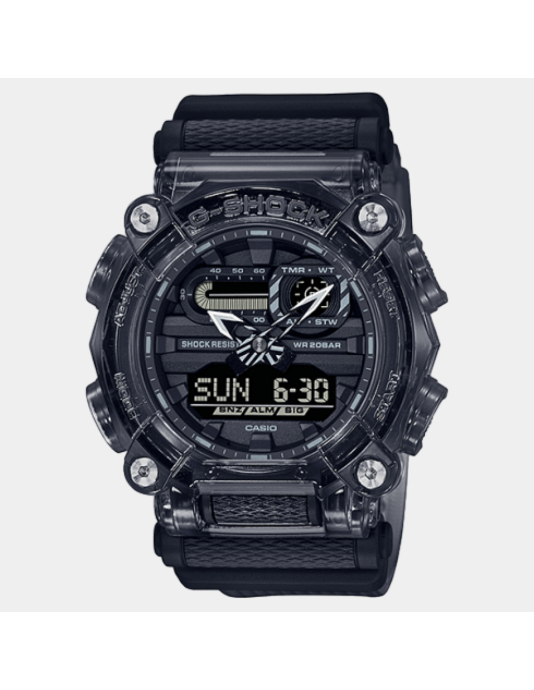 The GA‑900SKE‑8ADR is a semi-transparent “Skeleton” edition in the rugged GA‑900 lineup. Its translucent gray resin case and band highlight the inner mechanics, combining toughness with modern street-style aesthetics. Built for heavy-duty use with a 3D dial and large front button for easy operation, it offers practical functions like shock resistance, 200m water resistance, and an easy-to-read analog-digital display. Perfect for those who want durability with a unique, urban look.