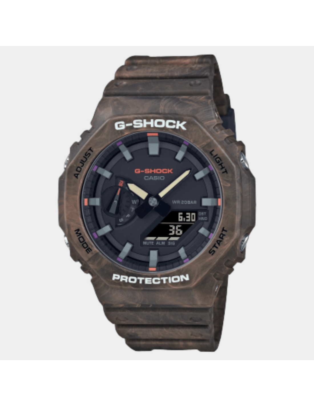This G-Shock GA-2100FR-5ADR watch features:, Resin Band Material, Resin Case Material, Analog-Digital Display, 200M Water Resistance, Mineral Glass, Chronograph, Alarm clock, Stop Watch, World time, Hand Shift Feature, Neobrite Hands,