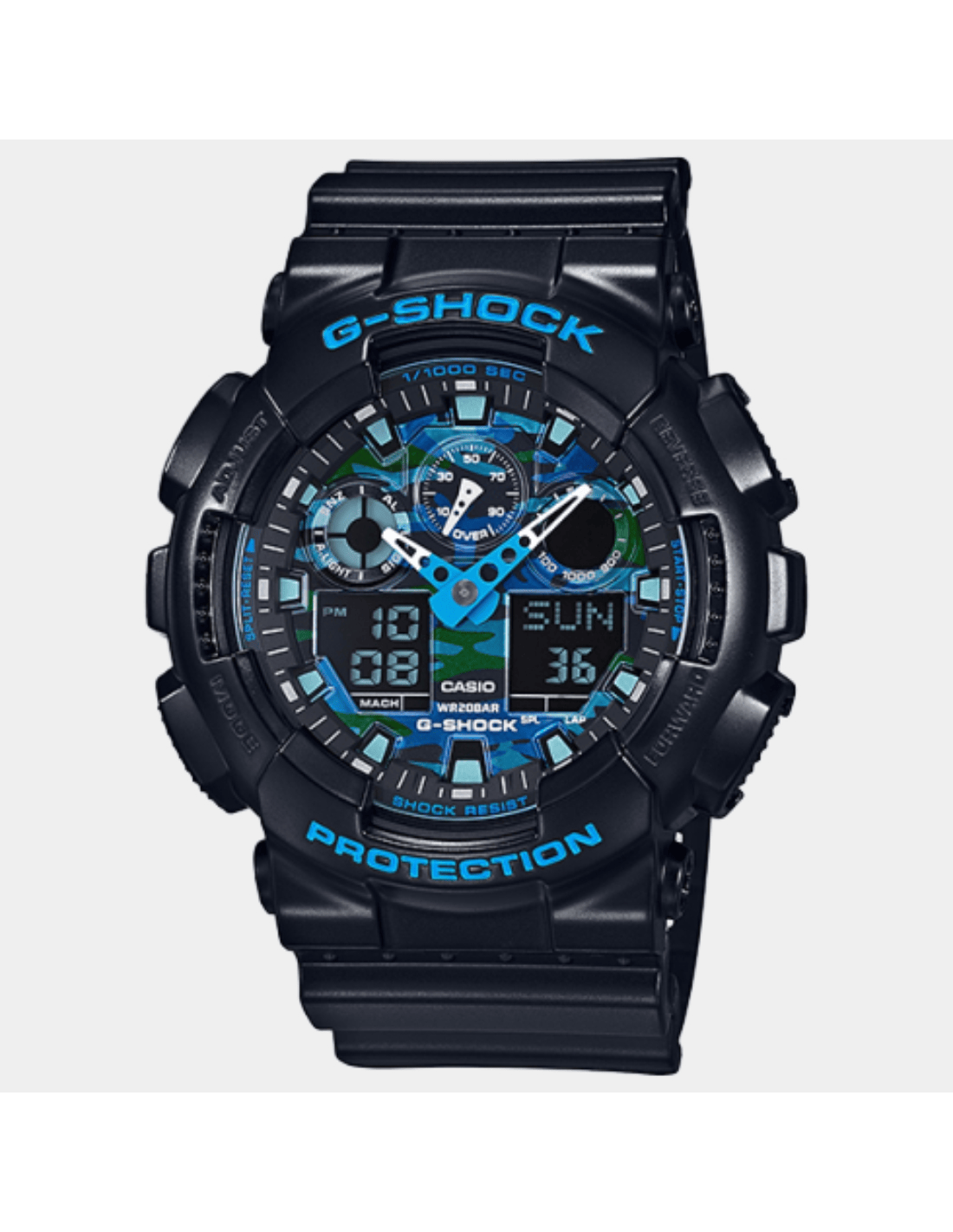 This G-Shock GA-100CB-1ADR watch features:, Resin Band Material, Resin Case Material, Analog-Digital Display, 200M Water Resistance, Mineral Glass, Chronograph, Alarm clock, Stop Watch, World time,