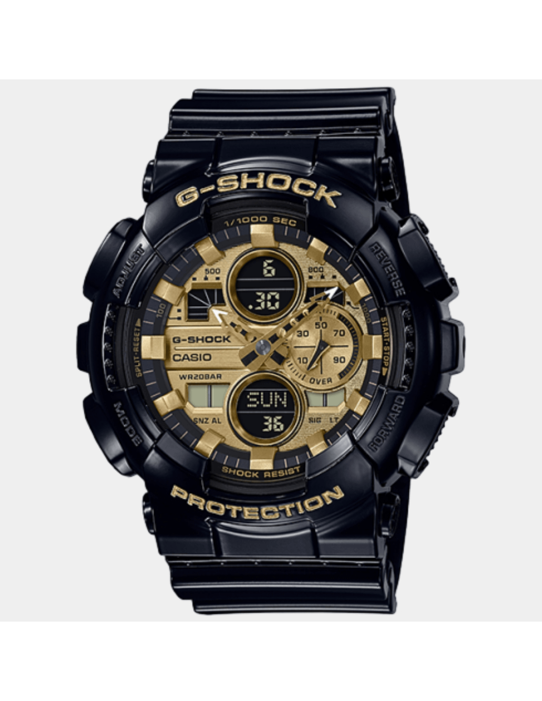 This G-Shock GA-140GB-1A1DR watch features:, Resin Band Material, Resin Case Material, Analog-Digital Display, 200M Water Resistance, Mineral Glass, Chronograph, Alarm clock, Stop Watch, World time,