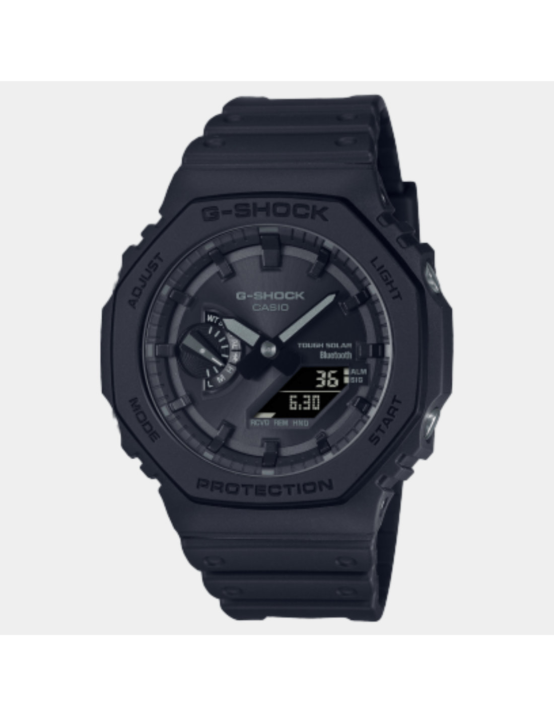 This G-SHOCK GA-B2100-1A1DR watch features:, Resin Band Material, Carbon Case Material, Analog-Digital Display, 200M Water Resistance, Mineral Glass, Bluetooth Connectivity, Chronograph, Alarm clock, Tough Solar, Stop Watch, World time, Hand Shift Feature, Phone Finder, Neobrite Hands,