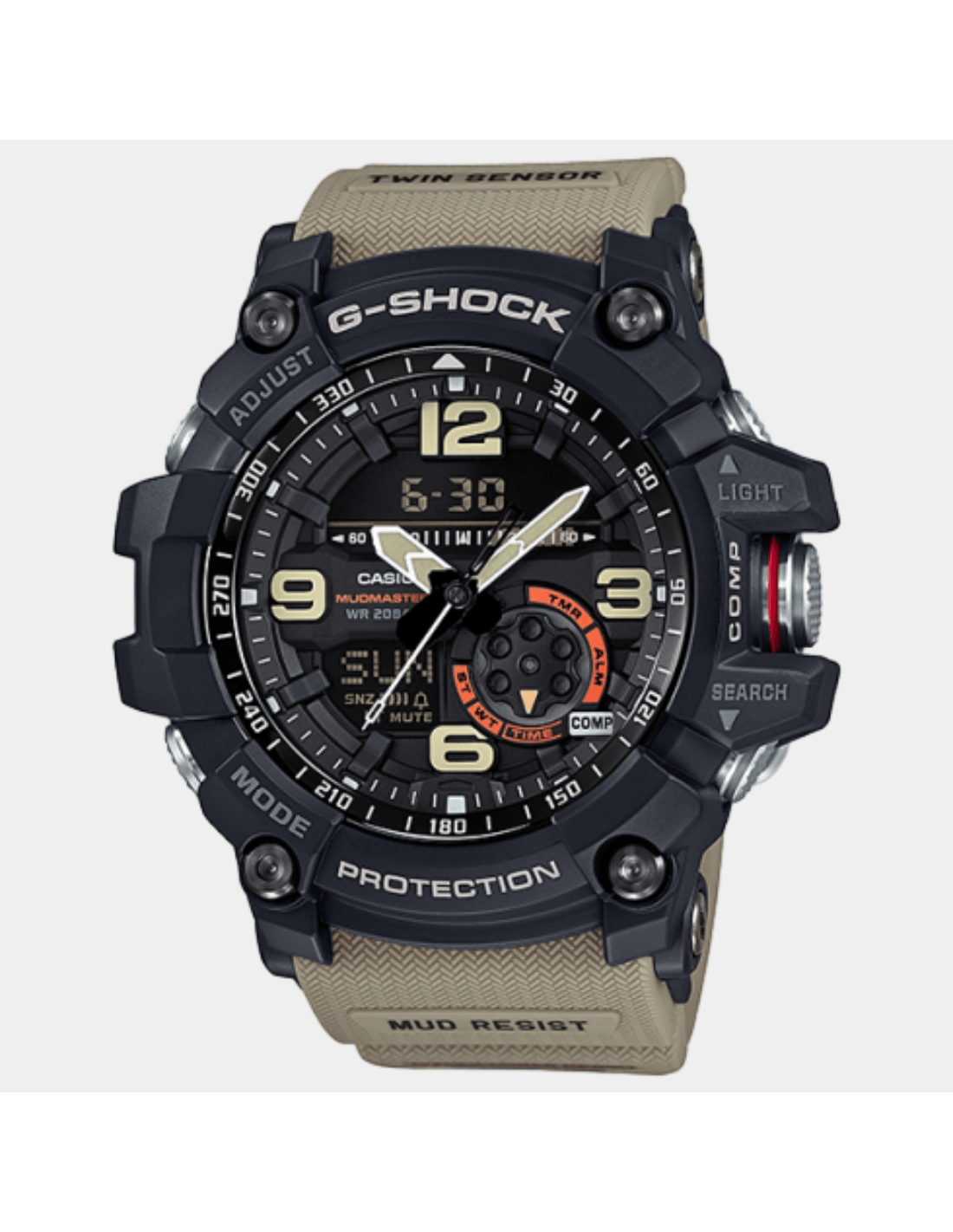 This G-Shock GG-1000-1A5DR watch features:, Resin Band Material, Resin/ Stainless Steel Case Material, Analog-Digital Display, 200M Water Resistance, Mineral Glass, Chronograph, Alarm clock, Compass, Stop Watch, Thermometer, World time, Neobrite Hands,