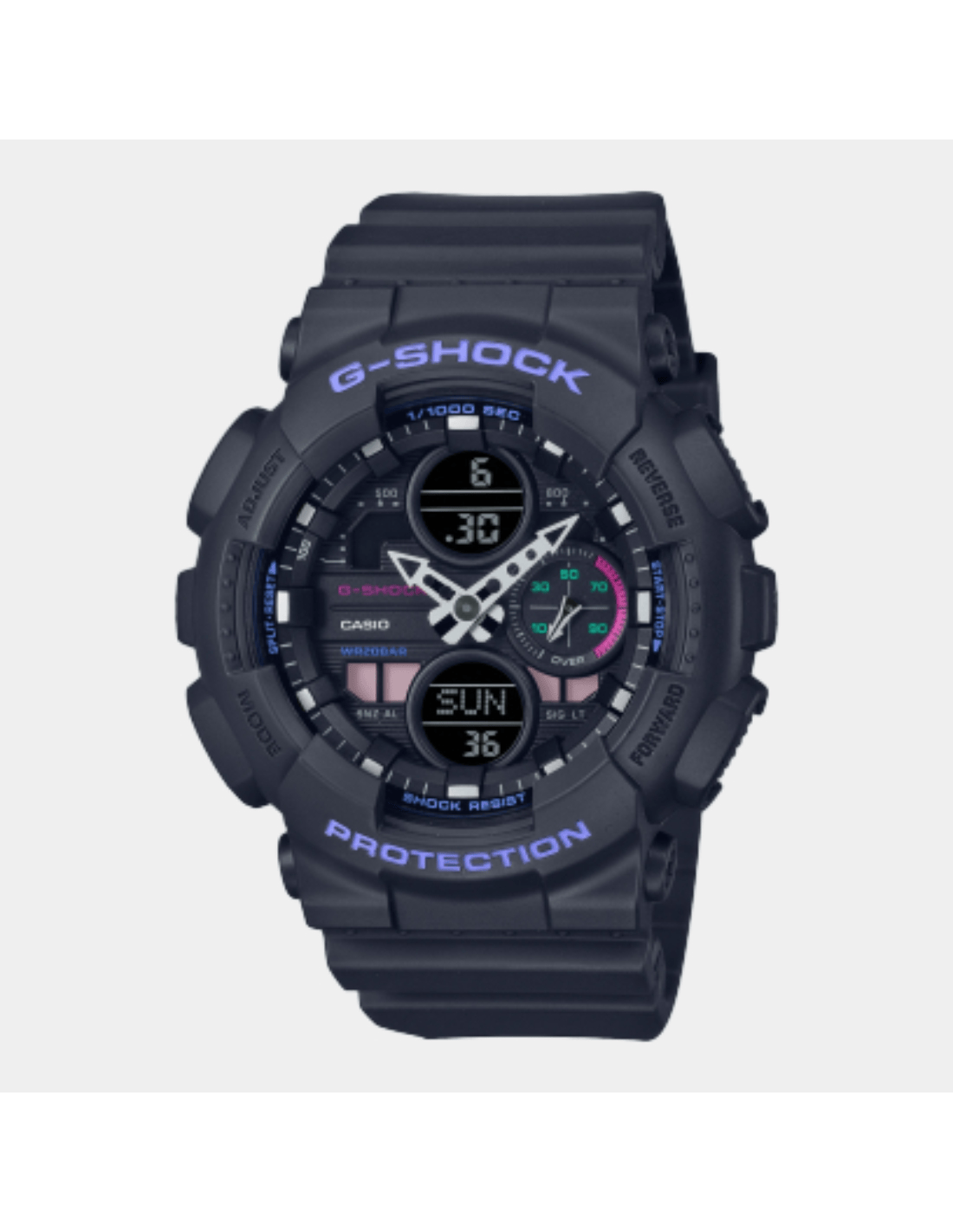 This G-Shock GMA-S140-8ADR watch features:, Resin Band Material, Resin Case Material, Analog-Digital Display, 200M Water Resistance, Mineral Glass, Chronograph, Alarm clock, Stop Watch, World time,