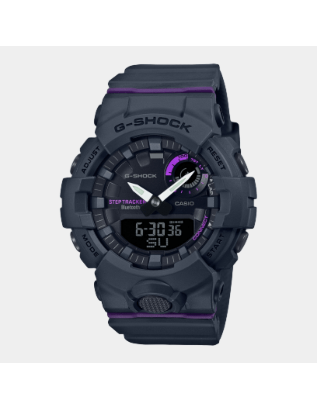 This G-Shock GMA-B800-8ADR watch features:, Resin Band Material, Resin Case Material, Analog-Digital Display, 200M Water Resistance, Mineral Glass, Bluetooth Connectivity, Chronograph, Alarm clock, Step Tracker, Stop Watch, Hand Shift Feature, Dual time, Neobrite Hands,
