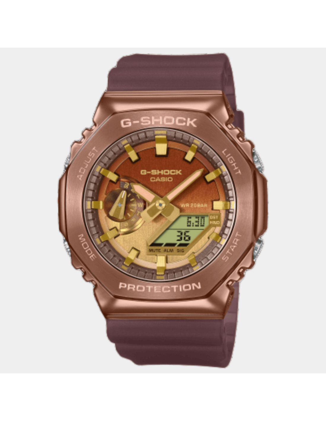 This G-SHOCK GM-2100CL-5ADR watch features:, Resin Band Material, Resin Case Material, Analog-Digital Display, 200M Water Resistance, Mineral Glass, Chronograph, Alarm clock, Stop Watch, World time, Neobrite Hands,