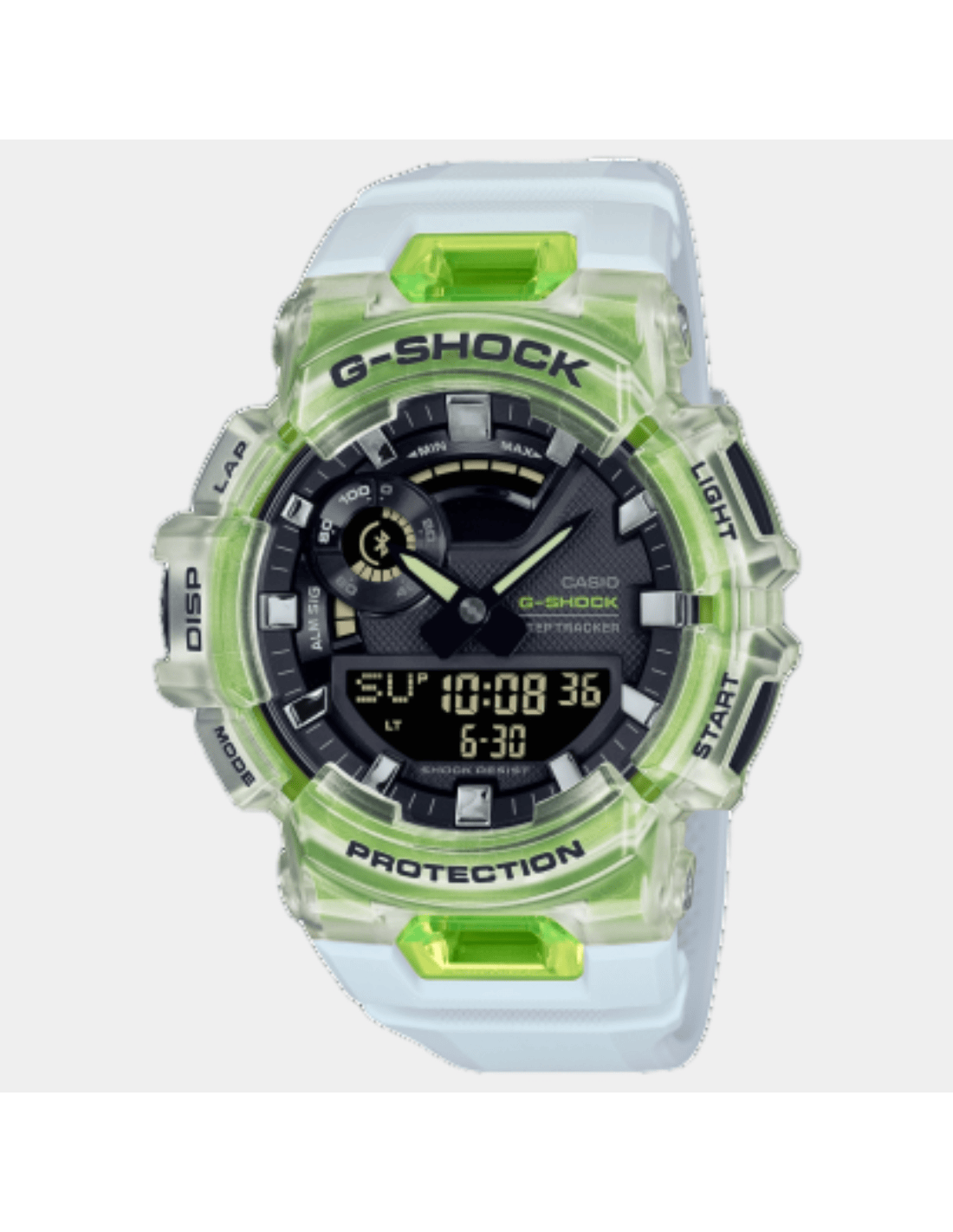 This G-Shock GBA-900SM-7A9DR watch features:, Resin Band Material, Resin Case Material, Analog-Digital Display, 200M Water Resistance, Mineral Glass, Bluetooth Connectivity, Chronograph, Alarm clock, Step Tracker, Stop Watch, Hand Shift Feature, Dual time, Neobrite Hands,