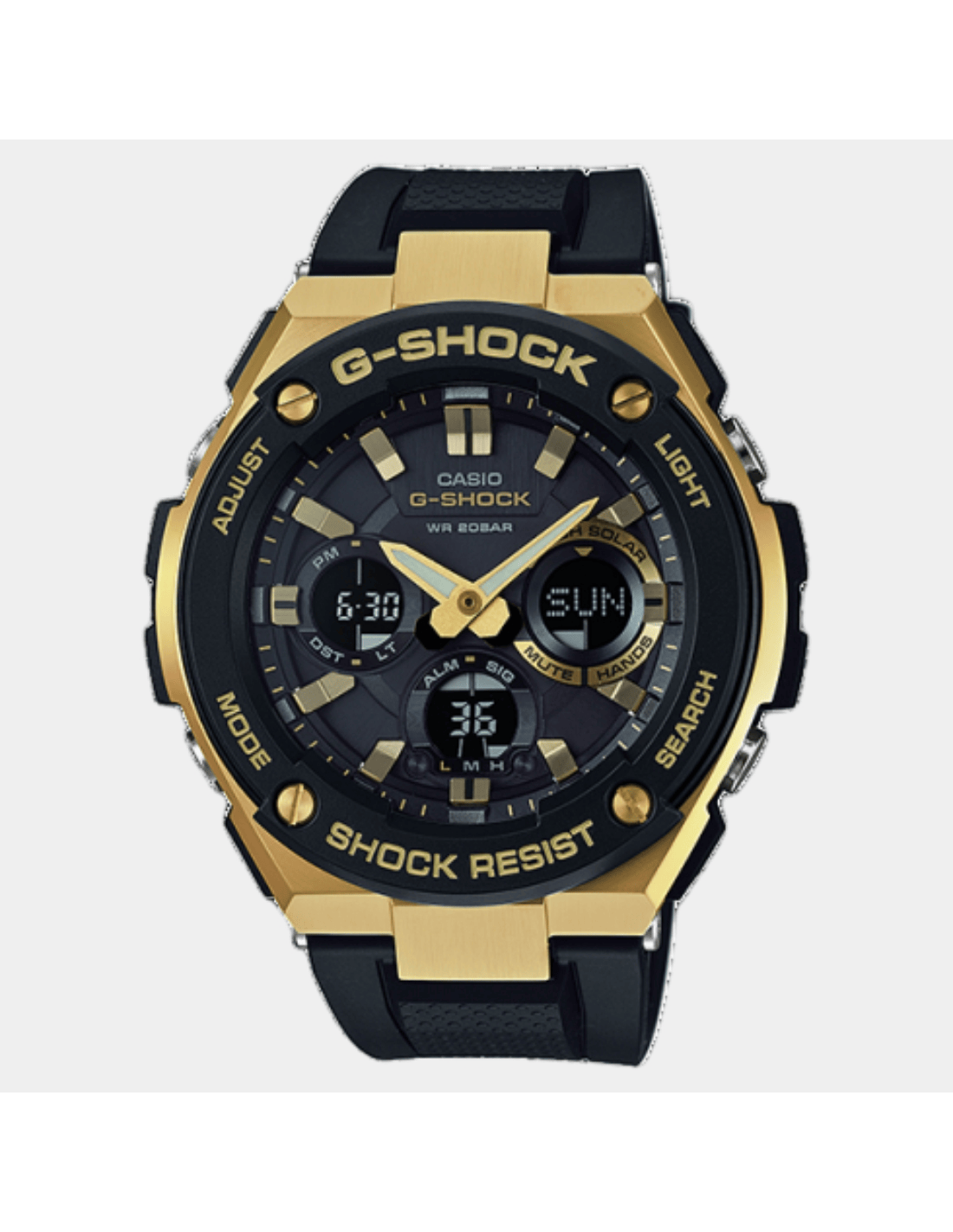 This G-Shock GST-S100G-1ADR watch features:, Resin Band Material, Resin/ Stainless Steel Case Material, Analog-Digital Display, 200M Water Resistance, Mineral Glass, Alarm clock, World time, Hand Shift Feature, Dual time, Neobrite Hands,