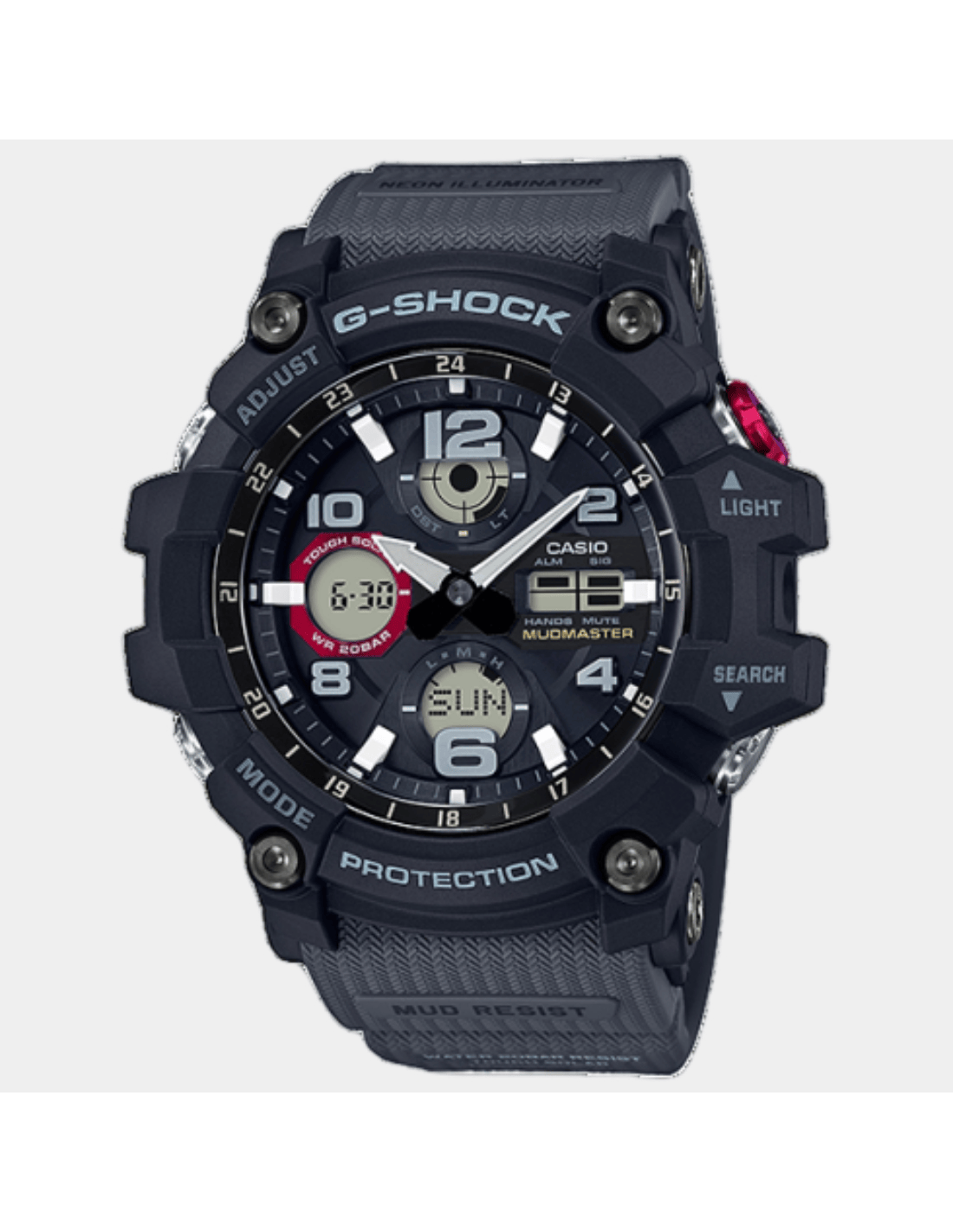 This G-Shock GSG-100-1A8DR watch features:, Resin Band Material, Resin/ Stainless Steel Case Material, Analog-Digital Display, 200M Water Resistance, Mineral Glass, Alarm clock, World time, Hand Shift Feature, Dual time, Neobrite Hands,