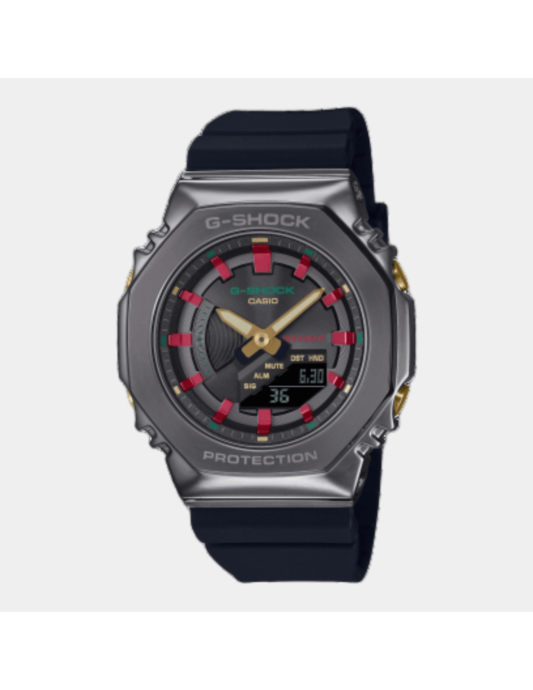 This G-Shock Women GM-S2100CH-1ADR watch features:, Resin Band Material, Resin / Stainless steel Case Material, Analog-Digital Display, 200M Water Resistance, Mineral Glass, Chronograph, Alarm clock, Stop Watch, World time, Hand Shift Feature, Neobrite Hands,
