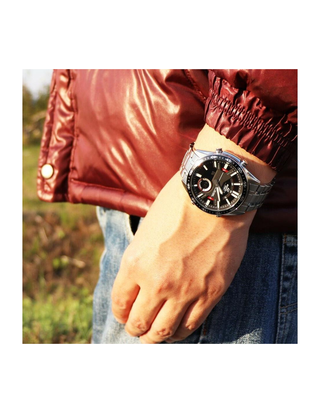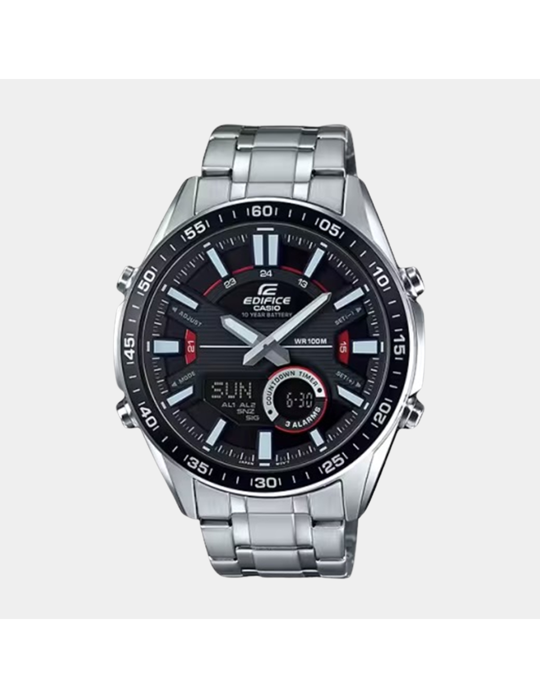 This Edifice EFV-C100D-1AVDF watch features:, Stainless Steel Band Material, Stainless Steel/Aluminium Case Material, Analog-Digital Display, 100M Water Resistance, Mineral Glass, Chronograph, Alarm clock, Stop Watch, World time, Dual time,