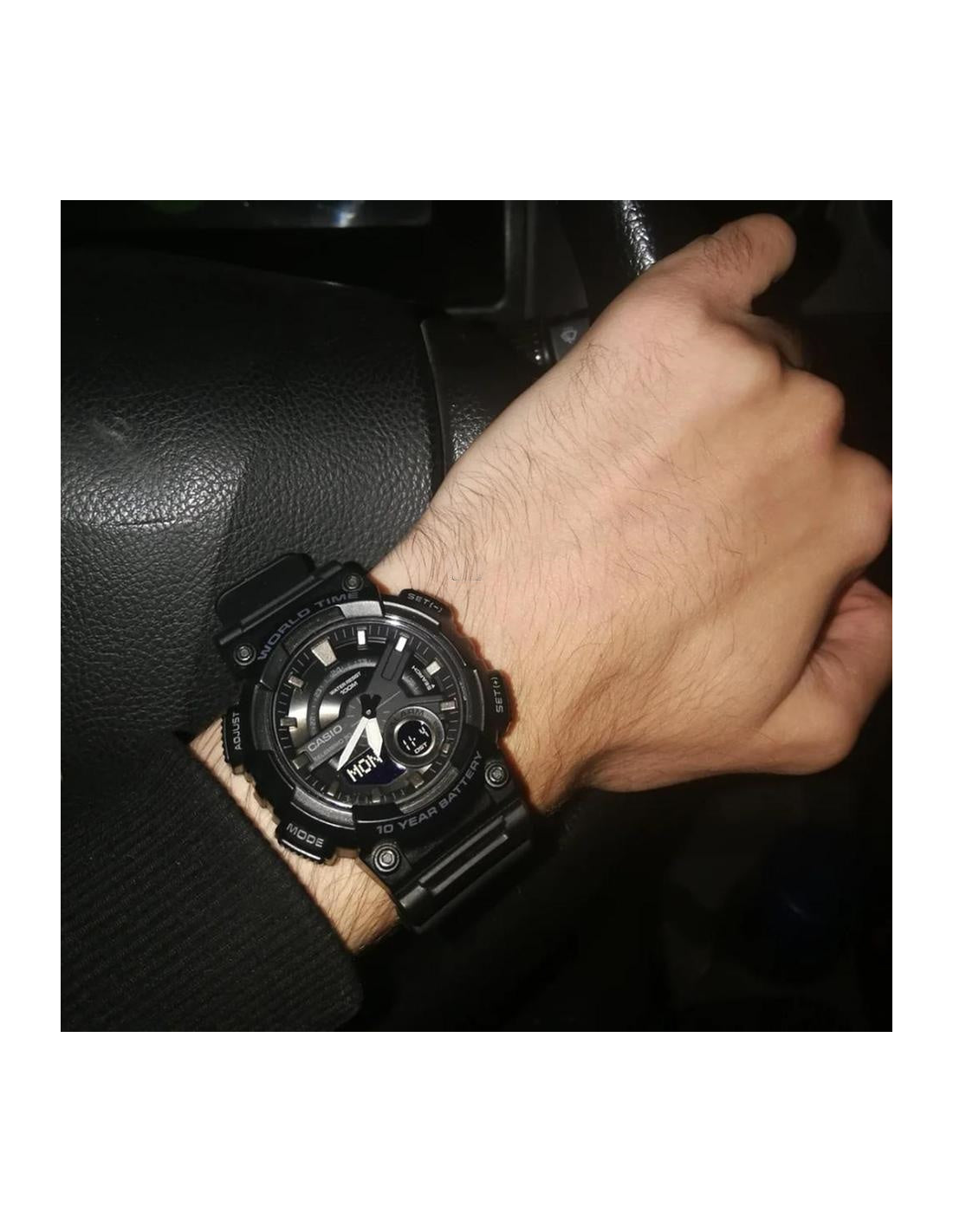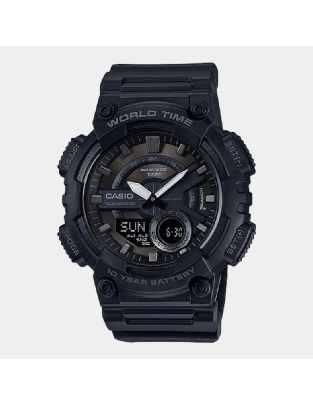 This Casio Resin AEQ-110W-1BVDF watch features:, Resin Band Material, Resin Case Material, Analog-Digital Display, 100M Water Resistance, Resin Glass, Alarm clock, World time,
