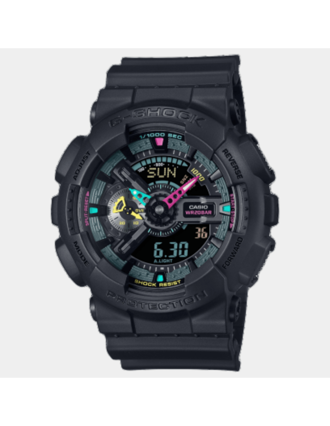 This G-SHOCK GA-110MF-1ADR watch features:, Resin Band Material, Resin Case Material, Analog-Digital Display, 200M Water Resistance, Mineral Glass, Chronograph, Alarm clock, Stop Watch, World time,