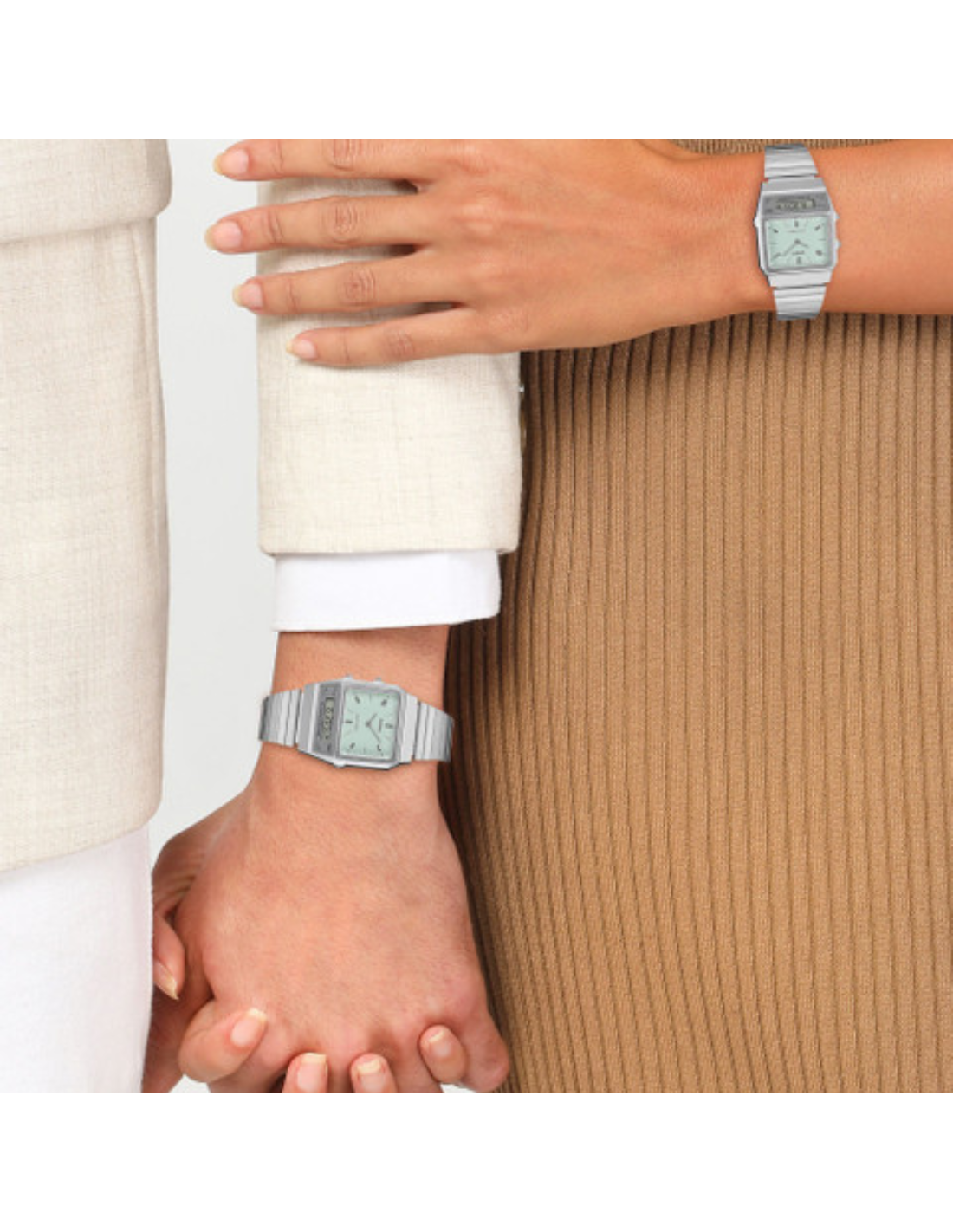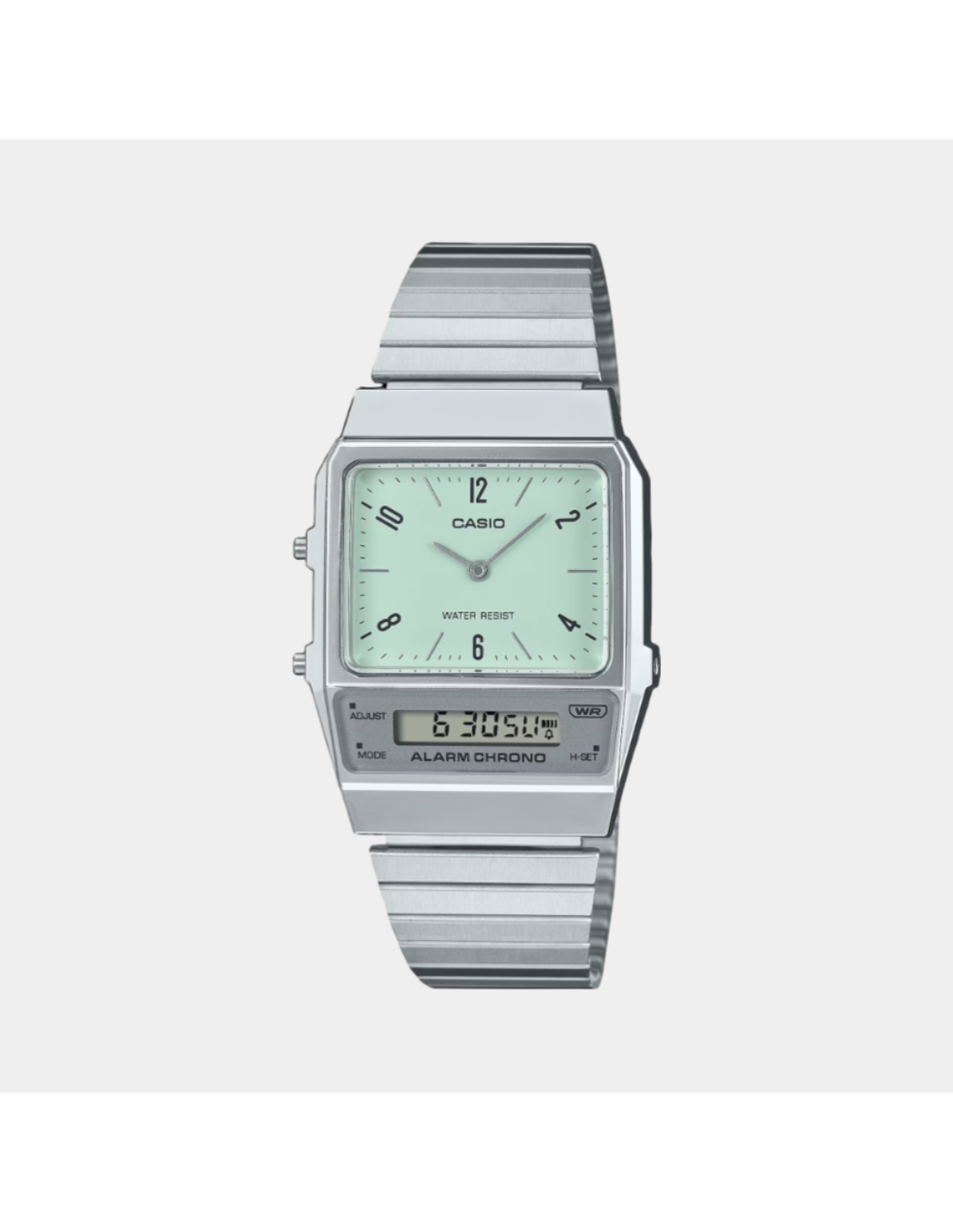 This VINTAGE AQ-800E-3ADF watch features:, Stainless Steel Band Material, Resin Case Material, Analog-Digital Display, Water Resistant Water Resistance, Resin Glass, Chronograph, Alarm clock, Stop Watch,