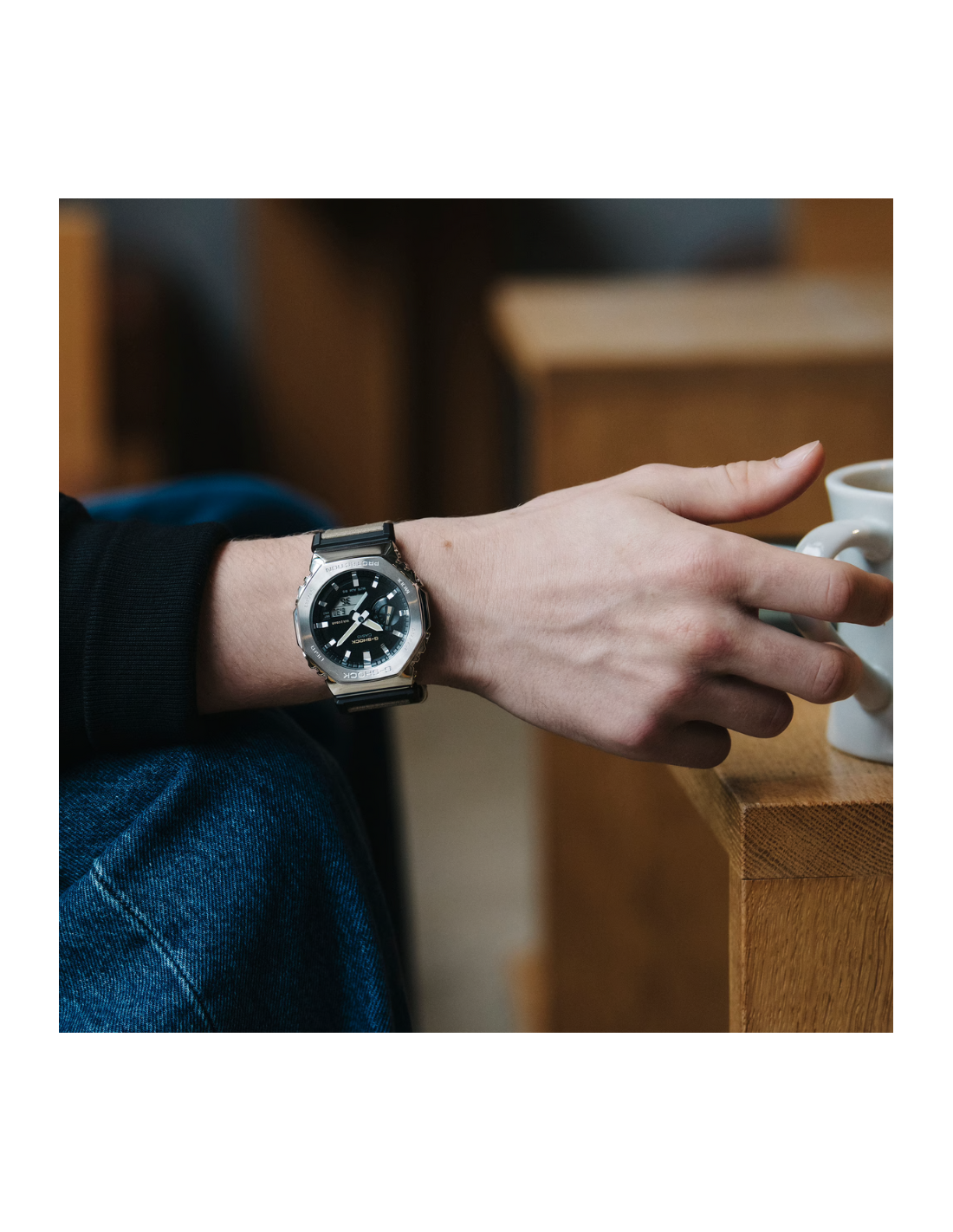 This G-SHOCK GM-2100C-5ADR watch features:, Cloth Band Material, Resin Case Material, Analog-Digital Display, 200M Water Resistance, Mineral Glass, Chronograph, Alarm clock, Stop Watch, World time, Hand Shift Feature, Neobrite Hands,