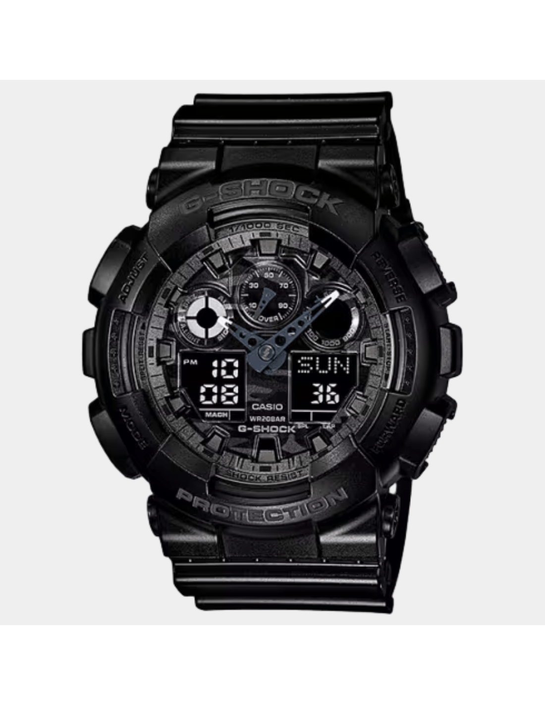 This G-Shock GA-100CF-1ADR watch features:, Resin Band Material, Resin Case Material, Analog-Digital Display, 200M Water Resistance, Mineral Glass, Chronograph, Alarm clock, Stop Watch, World time,