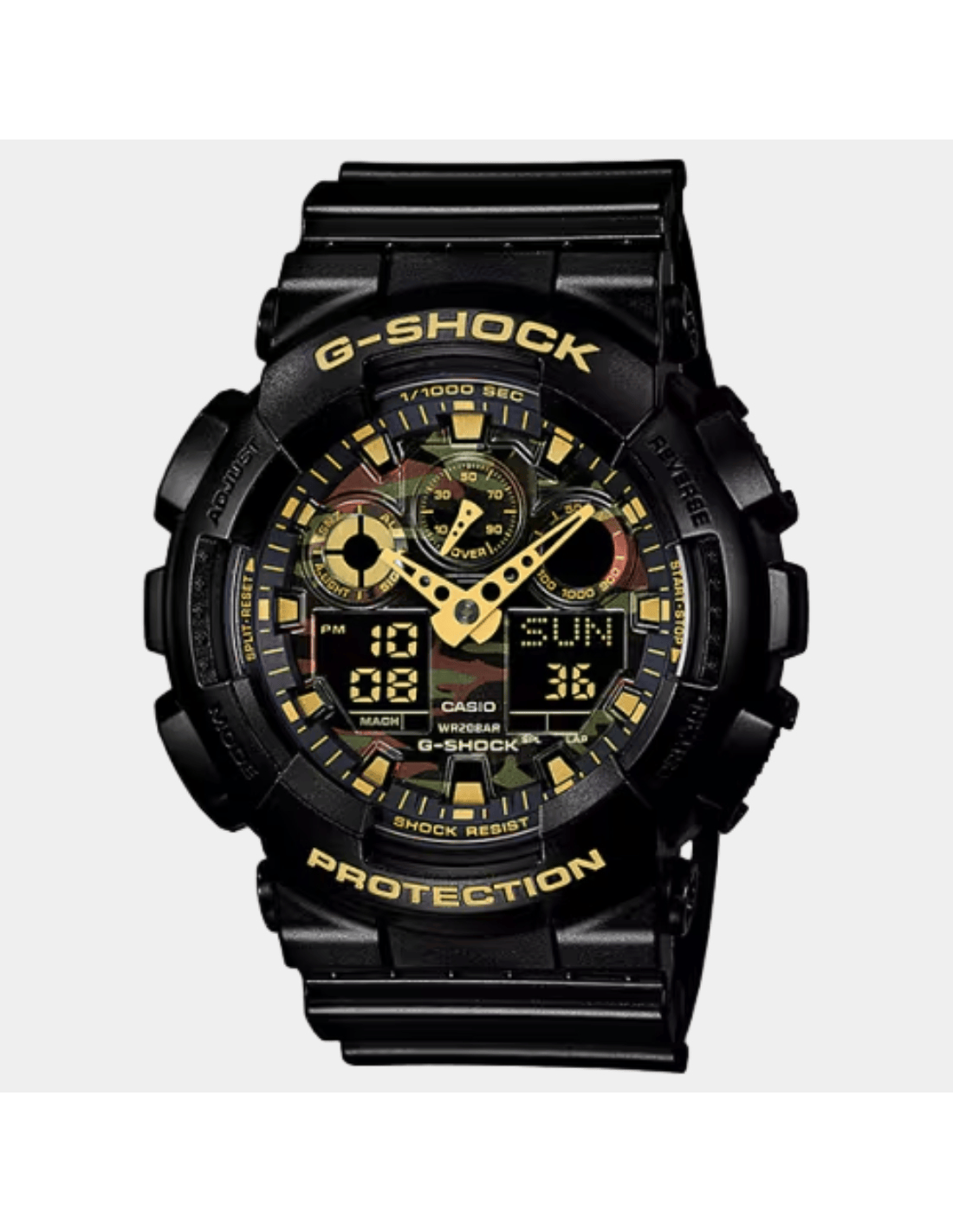 This G-Shock GA-100CF-1A9DR watch features:, Resin Band Material, Resin Case Material, Analog-Digital Display, 200M Water Resistance, Mineral Glass, Chronograph, Alarm clock, Stop Watch, World time,