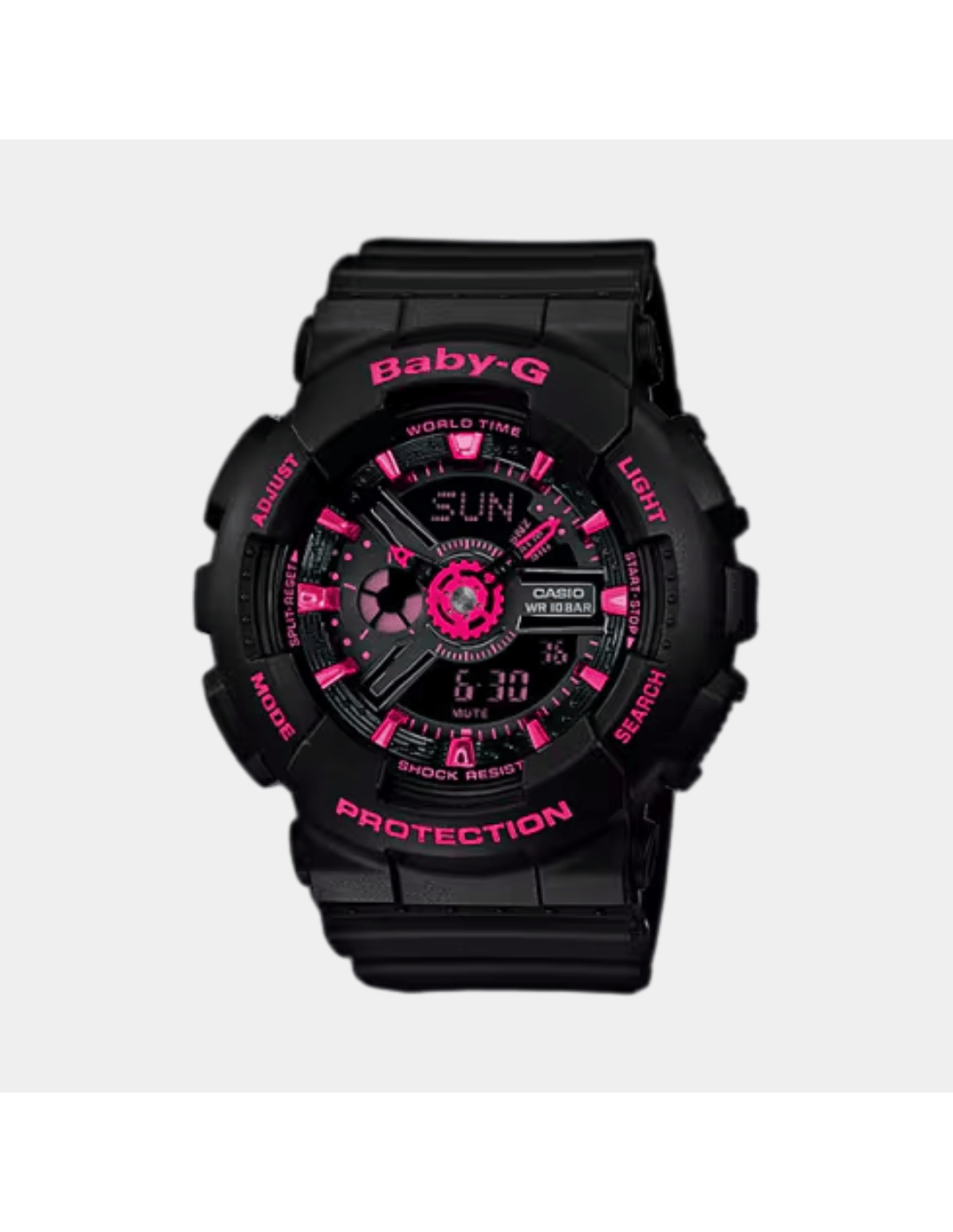 This Baby-G BA-111-1ADR watch features:, Resin Band Material, Resin Case Material, Analog-Digital Display, 100M Water Resistance, Mineral Glass, Alarm clock, World time, Dual time,