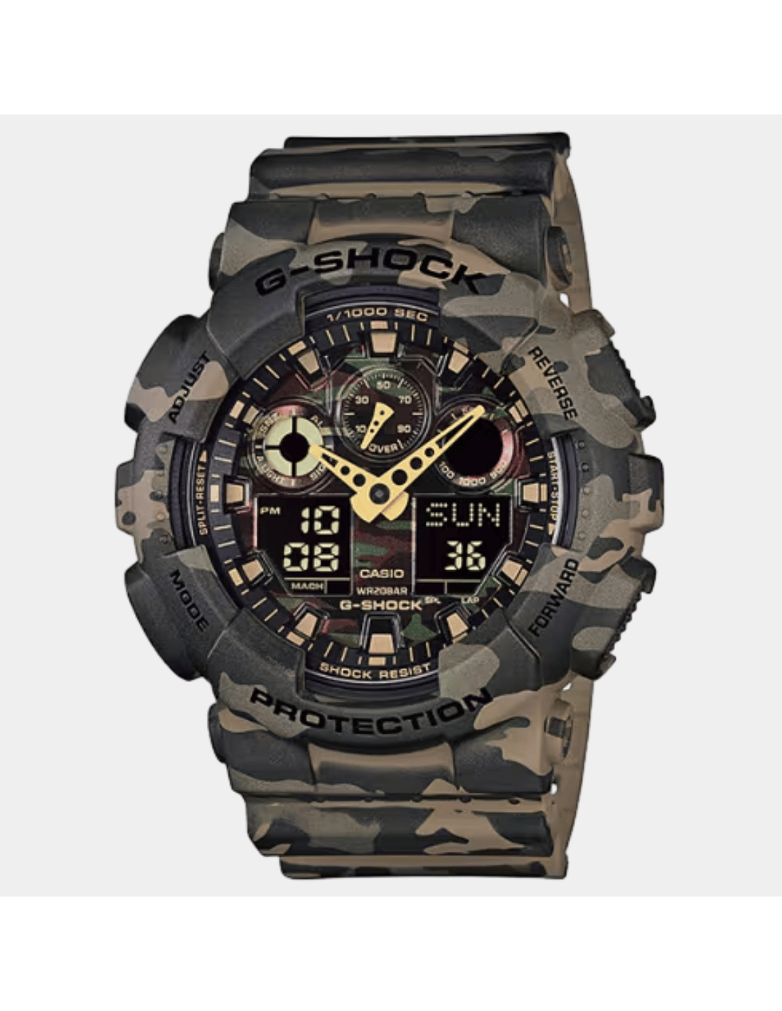 This G-Shock GA-100CM-5ADR watch features:, Resin Band Material, Resin Case Material, Analog-Digital Display, 200M Water Resistance, Mineral Glass, Chronograph, Alarm clock, Stop Watch, World time,