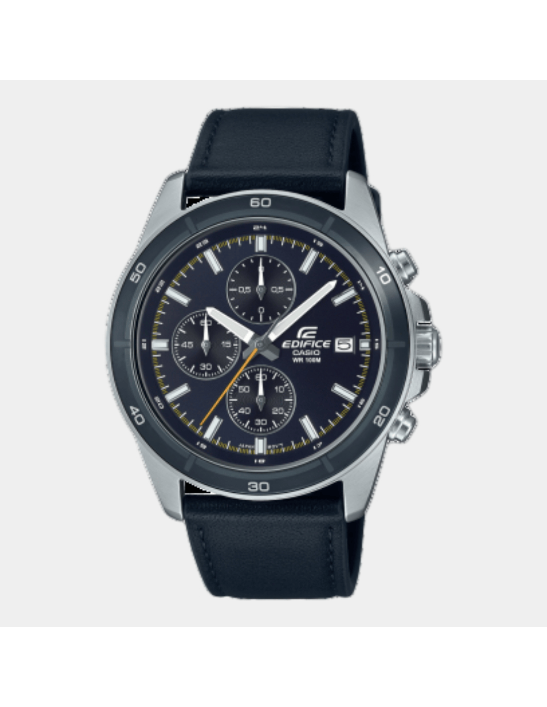 This EDIFICE EFR-526L-2CVUDF watch features:, Leather Band Material, Stainless Steel Case Material, Analog Display, 100M Water Resistance, Mineral Glass, Chronograph, Stop Watch,