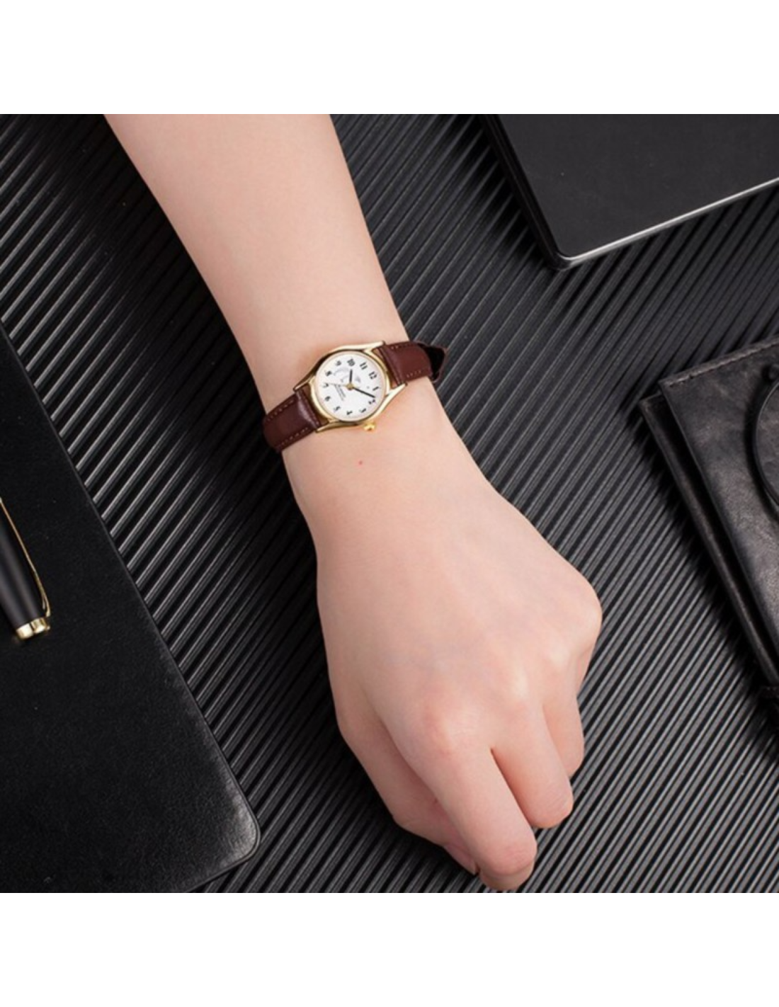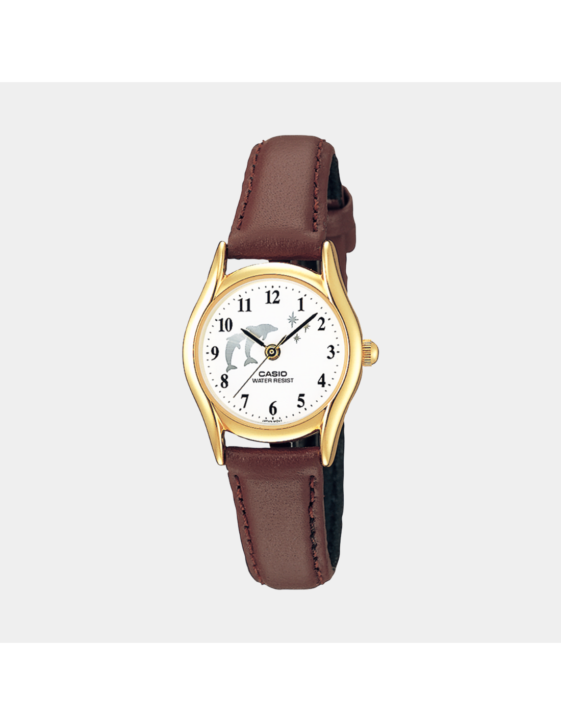 This Casio Women LTP-1094Q-7B9RDF watch features:, Genuine leather Band Material, Gold tone Case Material, Analog Display, Water Resistant Water Resistance, Mineral Glass,