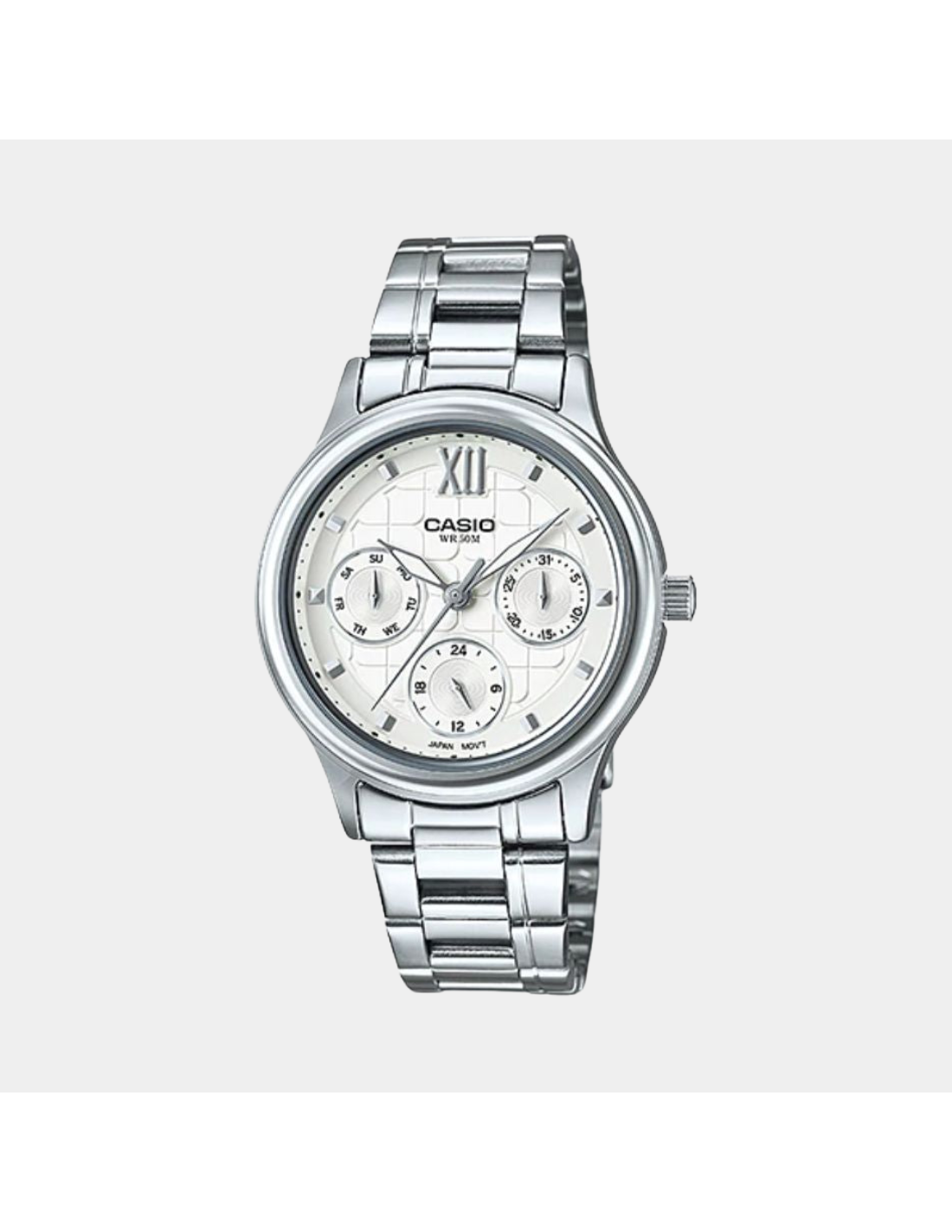 This Casio Women LTP-E306D-7AVDF watch features:, Stainless Steel Band Material, Stainless Steel Case Material, Analog Display, 50M Water Resistance, Mineral Glass,