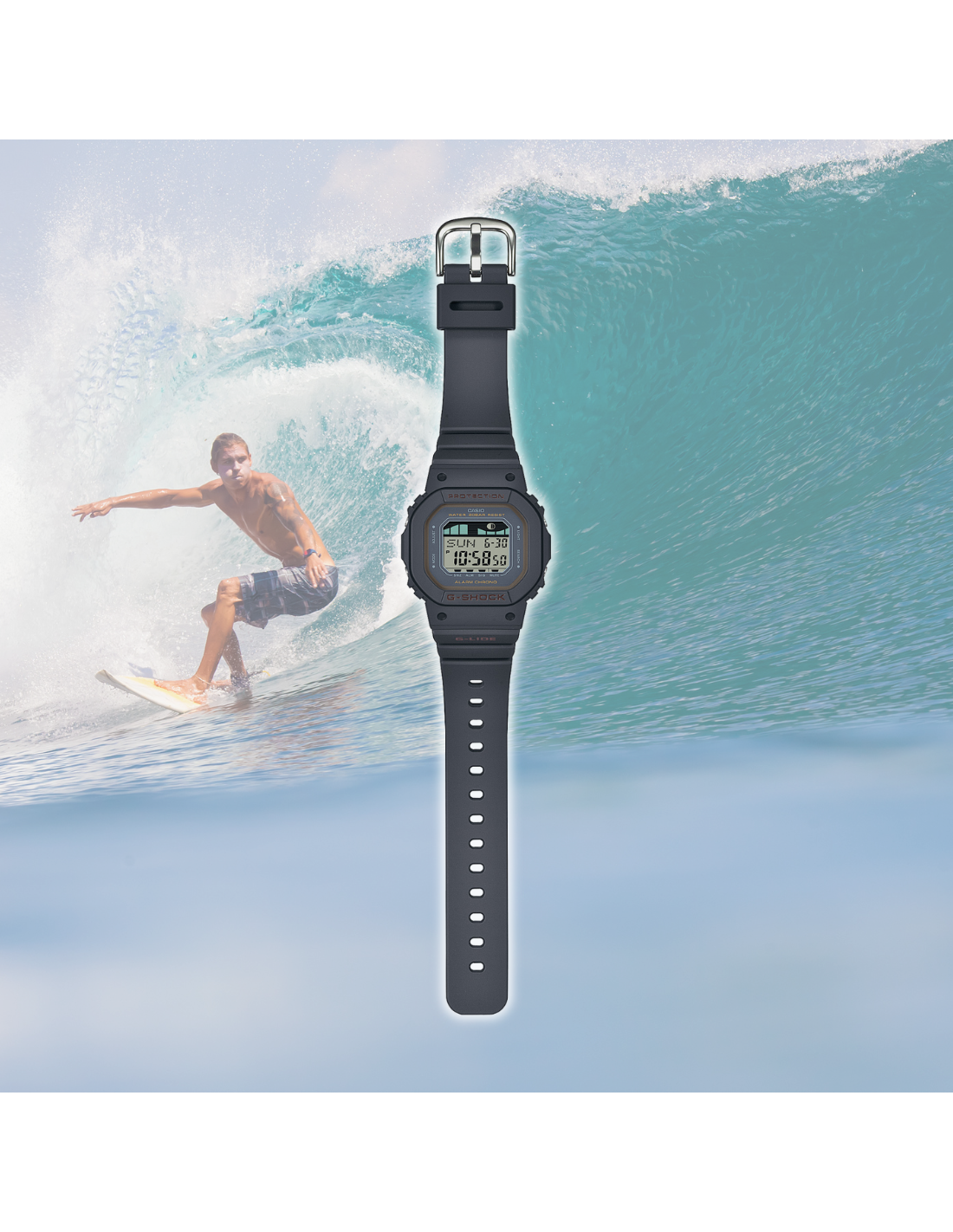 The G-SHOCK GLX-S5600-1DR is part of the G-LIDE series, designed specifically for surfers and ocean lifestyle enthusiasts. This model features a tide graph and moon phase display, which are highly useful for tracking tidal conditions and moon cycles for beach, surf, and coastal activities.