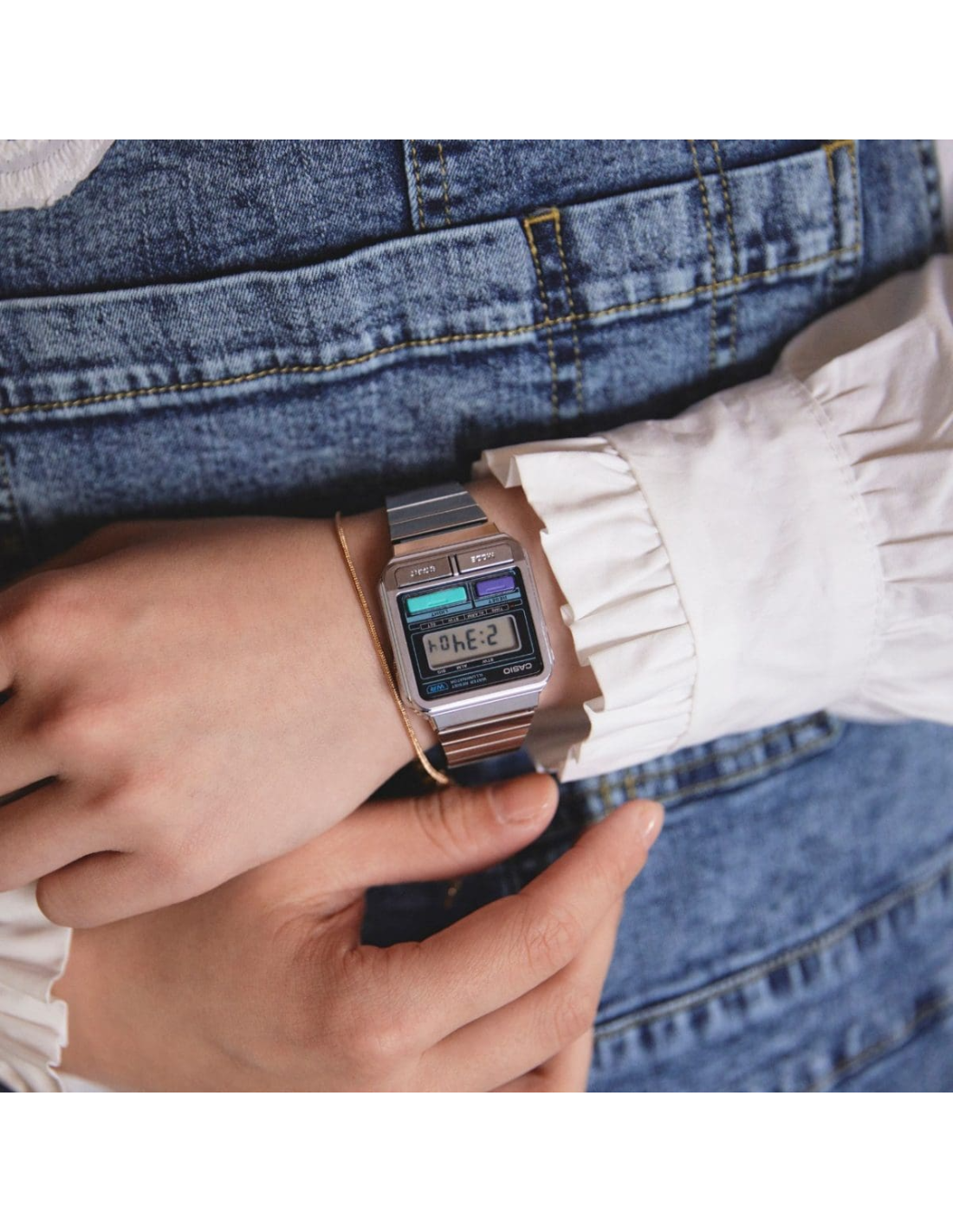 This Vintage A120WE-1ADF watch features:, Stainless Steel Band Material, Resin Case Material, Digital Display, Water Resistant Water Resistance, Resin Glass, Chronograph, Alarm clock, Stop Watch,