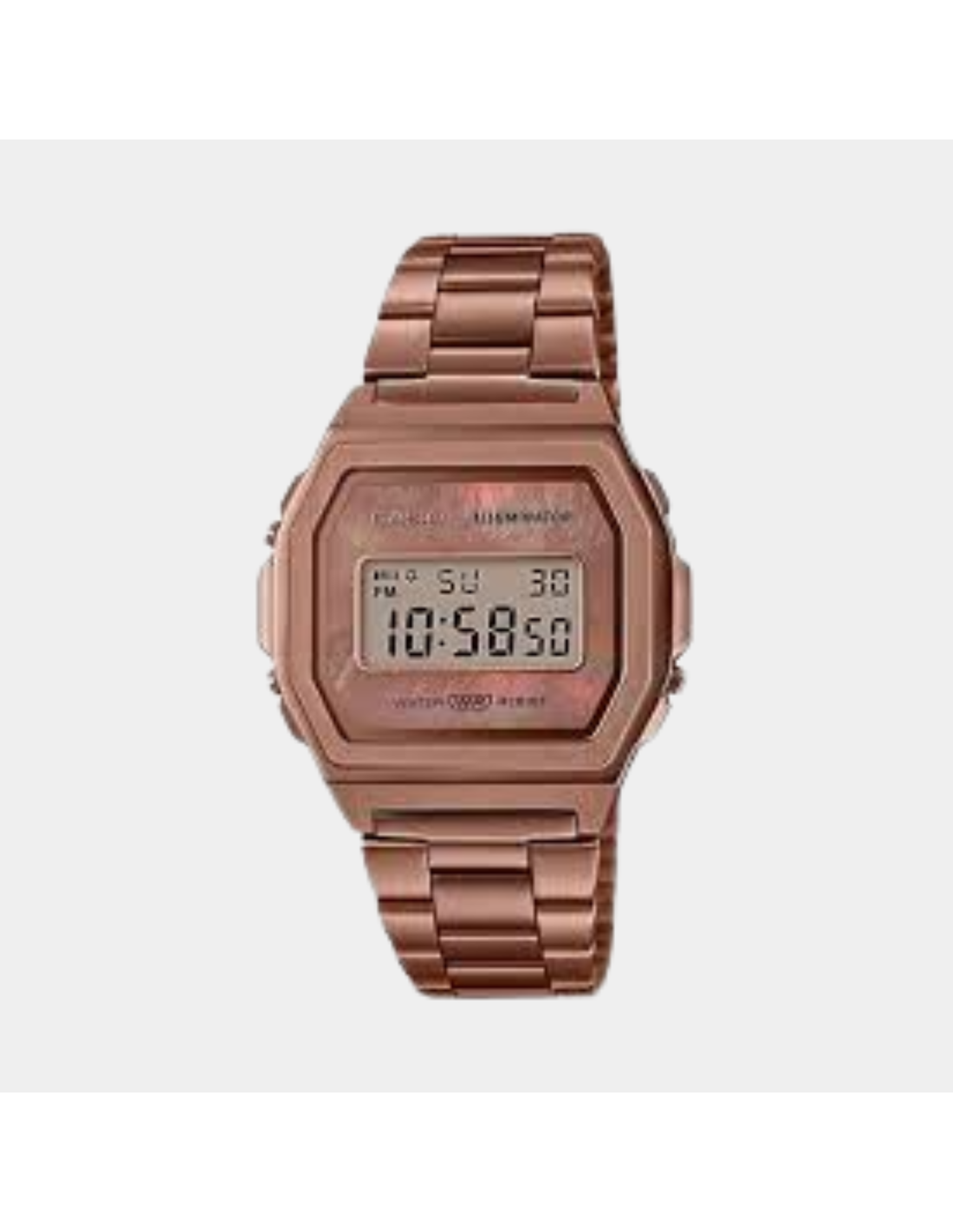 This Vintage A1000RG-5EF watch features:, Stainless Steel Band Material, Stainless Steel Case Material, Digital Display, Water Resistant Water Resistance, Mineral Glass, Chronograph, Alarm clock, Stop Watch,
