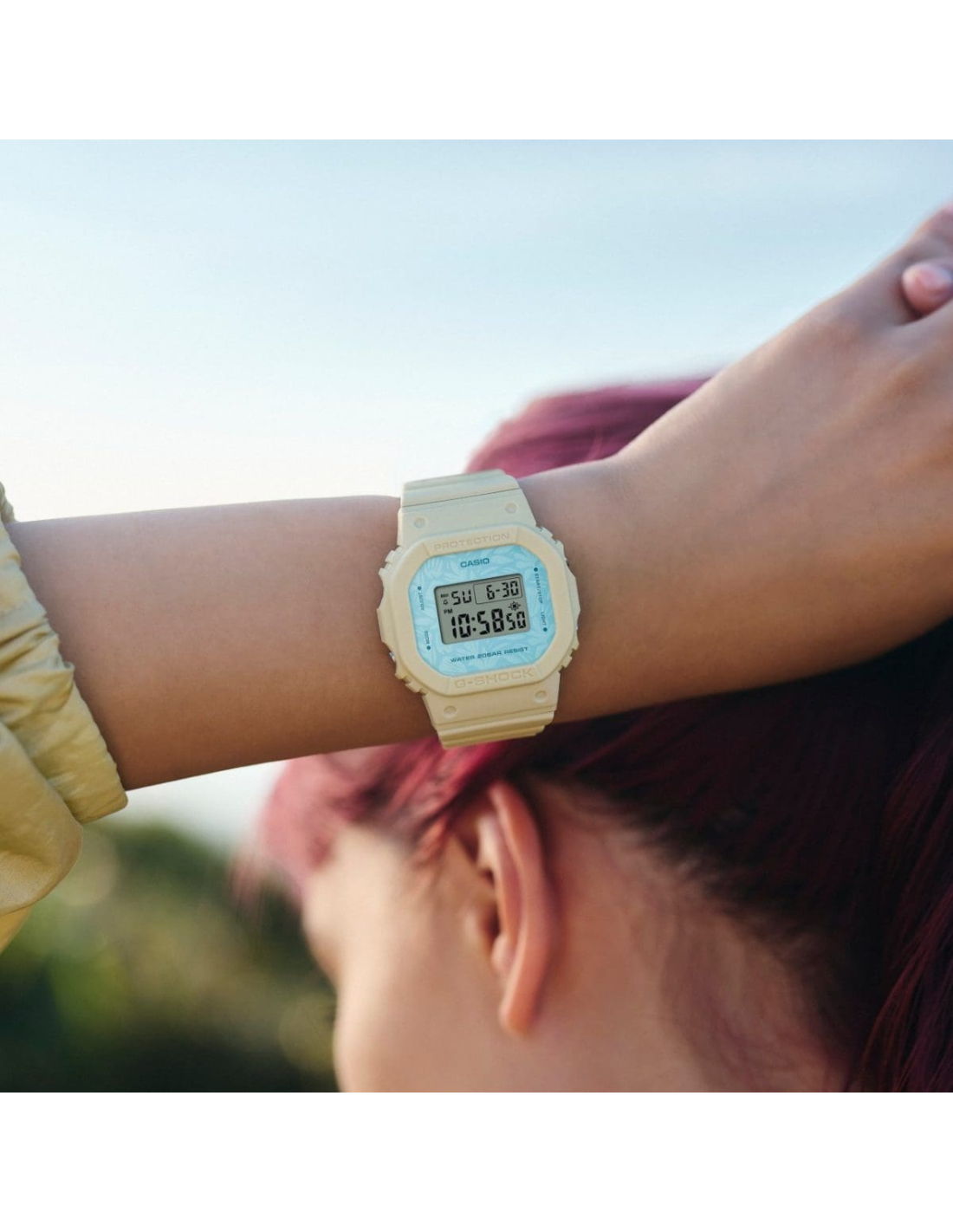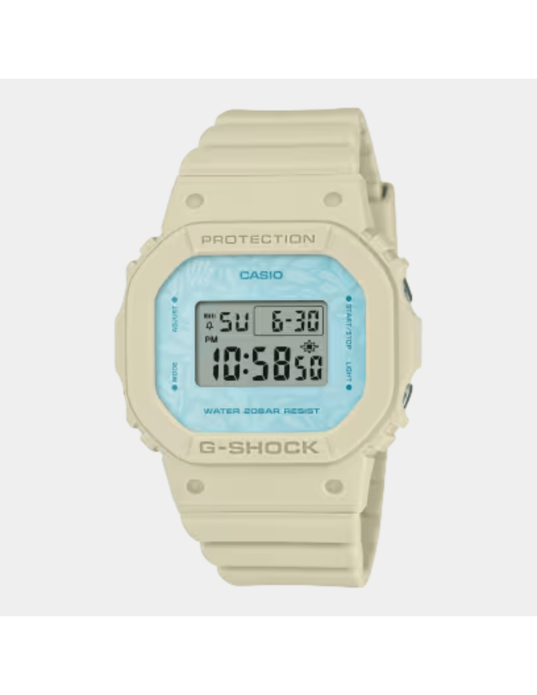 This G-Shock Women GMD-S5600NC-9DR watch features:, Bio-Based Resin Band Material, Resin / Bio-based Resin Case Material, Digital Display, 200M Water Resistance, Mineral Glass, Chronograph, Alarm clock, Stop Watch,