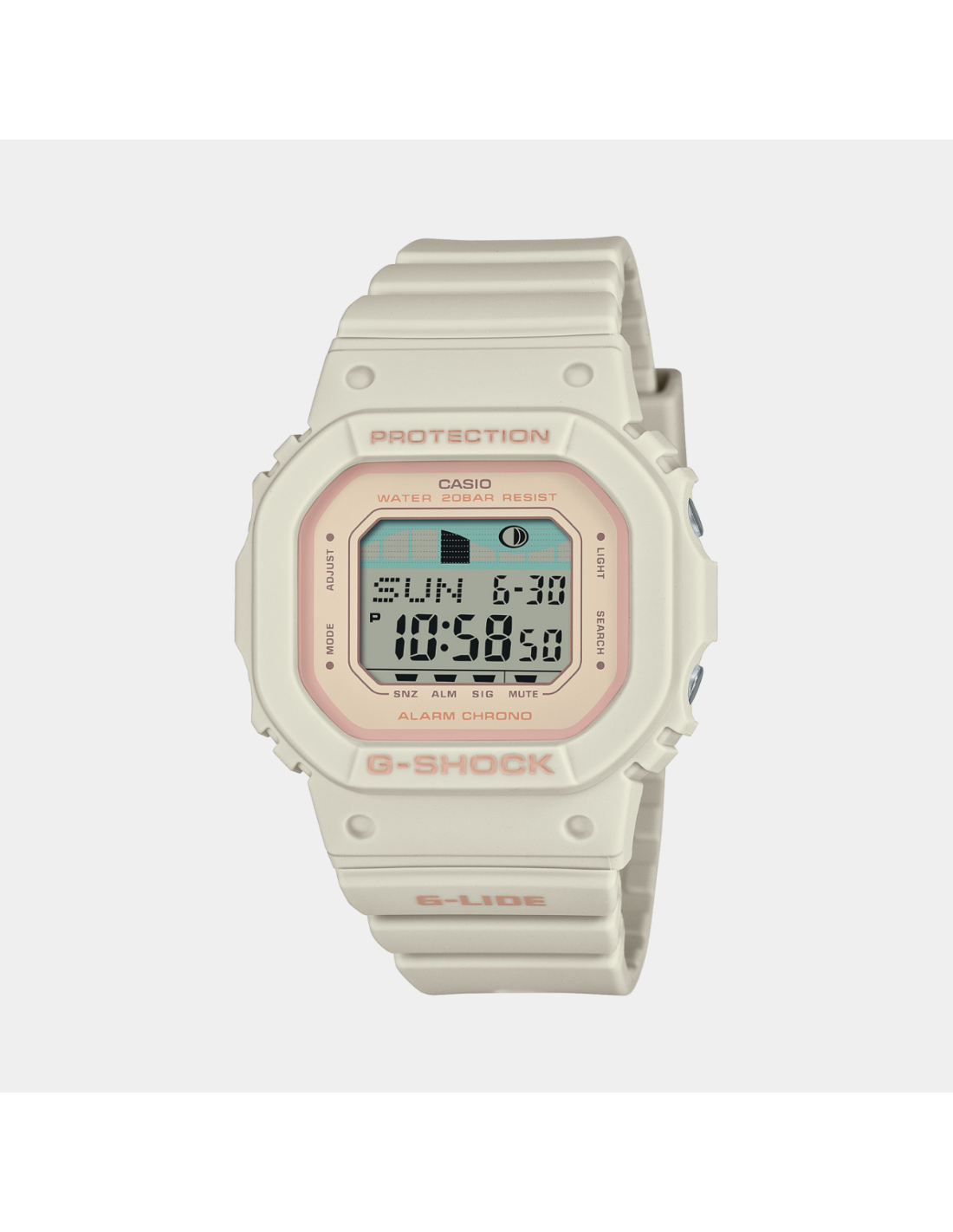 This G-Shock Women GLX-S5600-7BDR watch features:, Bio-Based Resin Band Material, Resin Case Material, Digital Display, 200M Water Resistance, Mineral Glass, Chronograph, Alarm clock, Moon Data/Tide Graph, Stop Watch, World time,