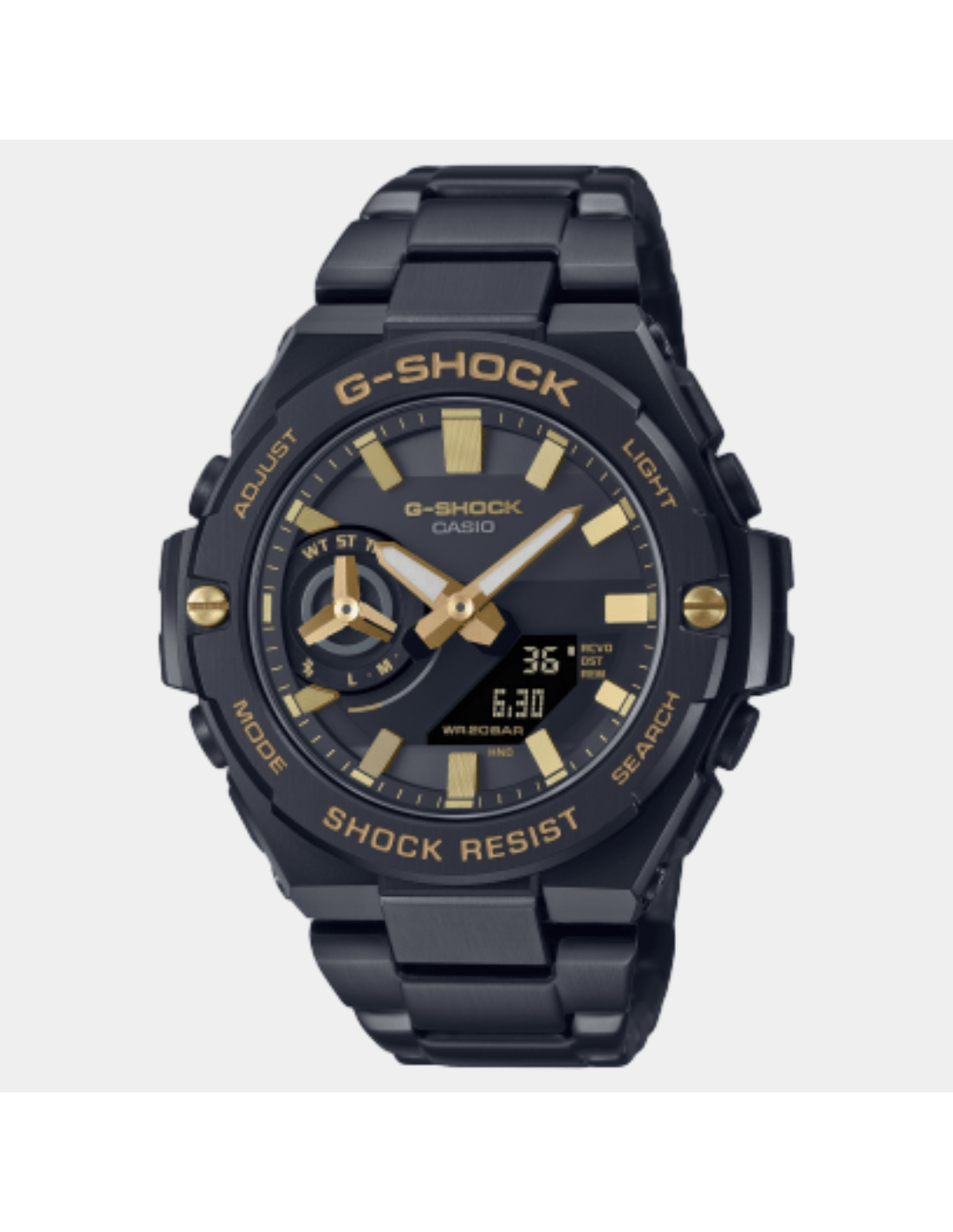 This G-SHOCK GST-B500BD-1A9DR watch features:, Stainless Steel Band Material, Resin Case Material, Analog-Digital Display, 200M Water Resistance, Mineral Glass, Bluetooth Connectivity, Chronograph, Alarm clock, Tough Solar, Stop Watch, World time, Hand Shift Feature,