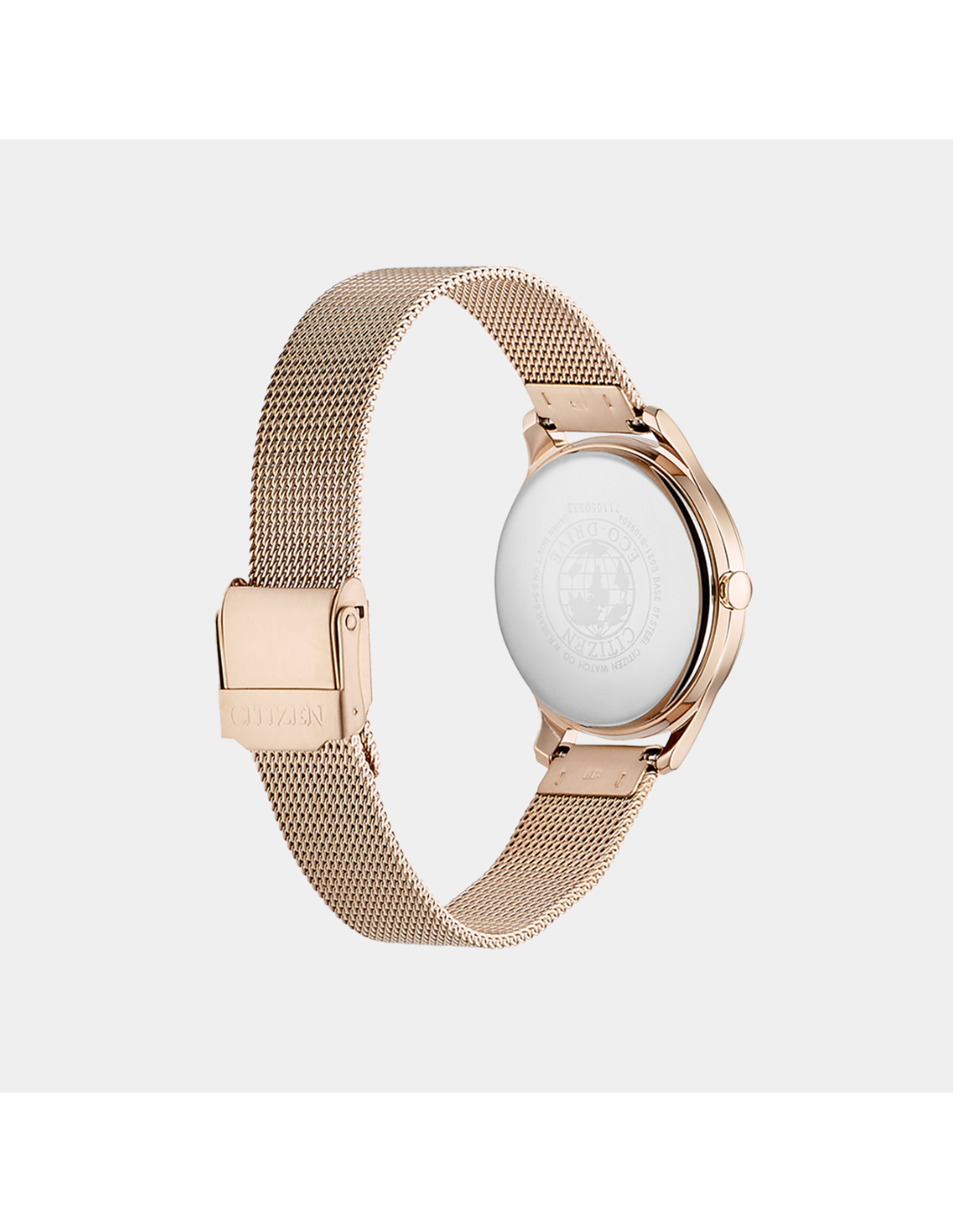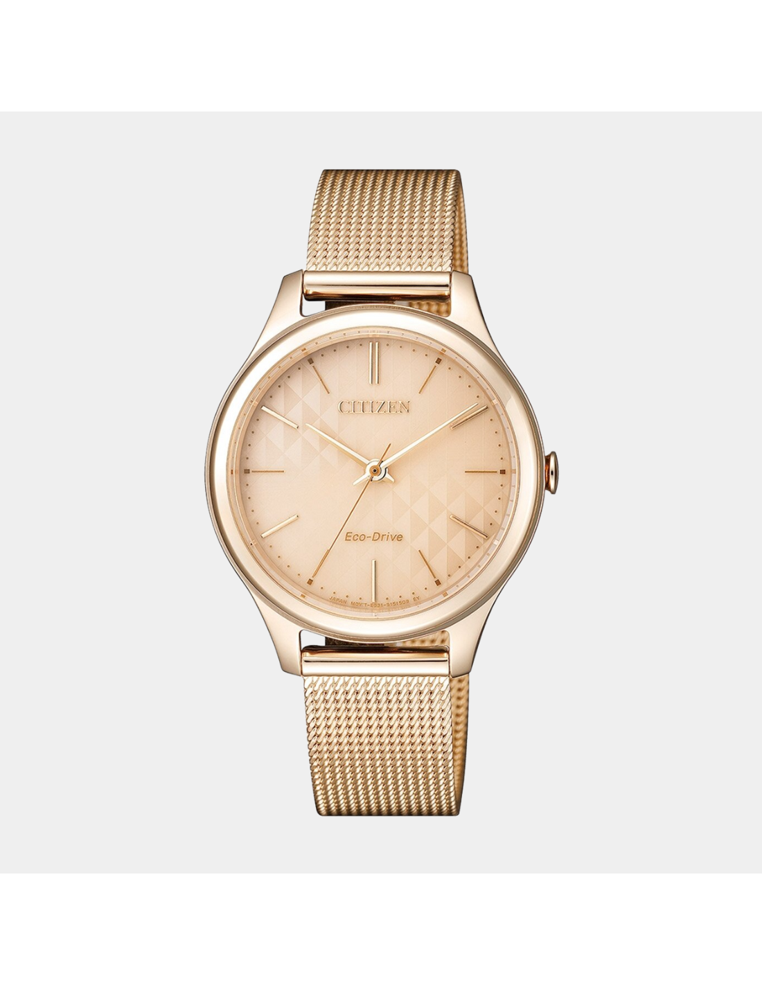 A sleek 32 mm rose‑gold-tone ladies’ Eco‑Drive watch featuring a light-rose dial and mesh stainless steel bracelet. Powered by light via Caliber E031, it never needs a battery change, offers about 180 days (6 months) power reserve, and includes energy warning and overcharge prevention. With minimal thickness (≈7 mm) and 50 m water resistance, it delivers refined elegance for everyday and evening wear.