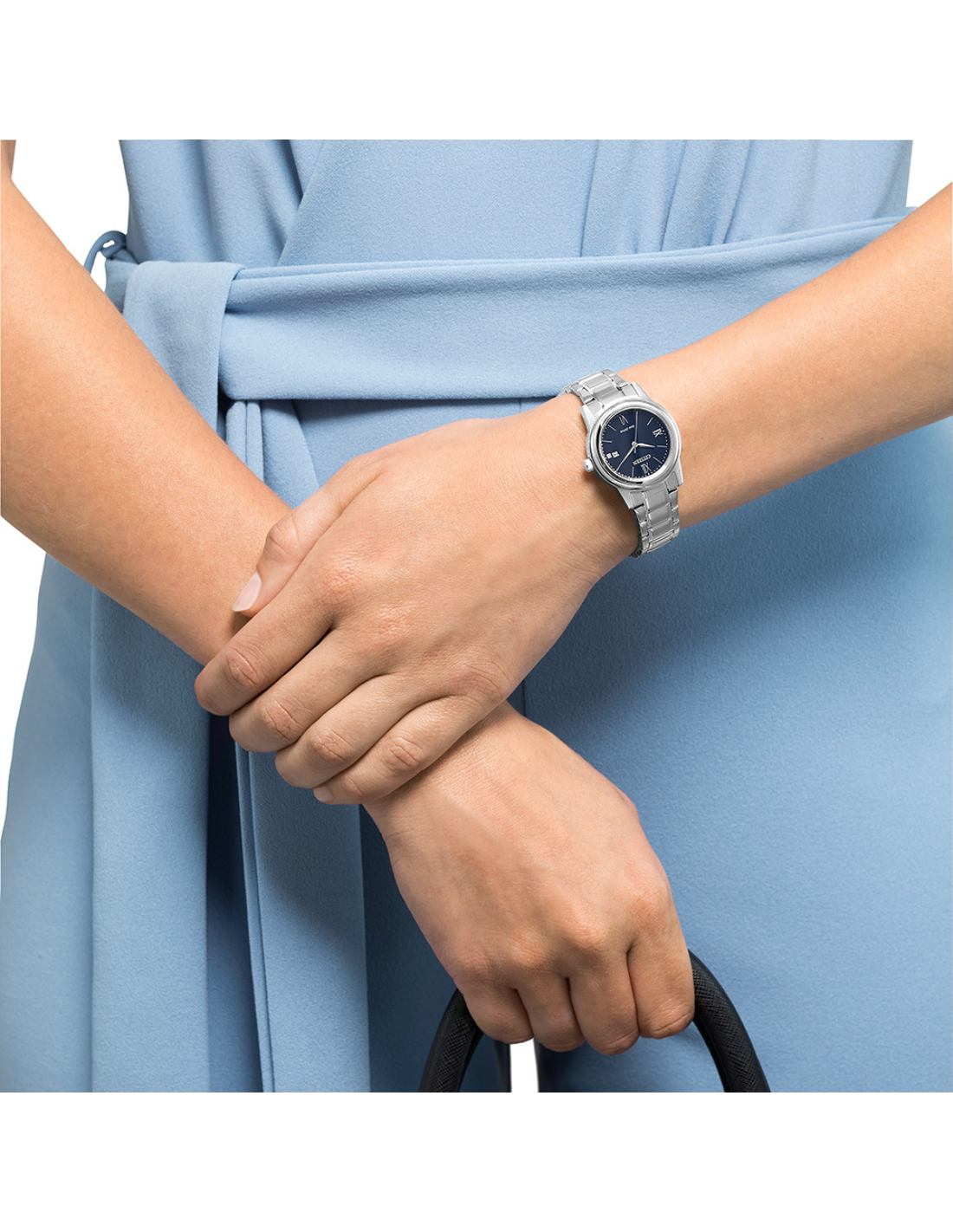 A refined 30 mm Eco‑Drive ladies’ watch, the FE1220‑89L features a blue dial with Roman numerals at key points and stainless steel bracelet. It’s solar-powered (no battery changes) with up to 8 months power reserve, date display, and 100 m water resistance. Compact yet sporty-elegant, it’s ideal for office-to-evening wear and light aquatic activities.