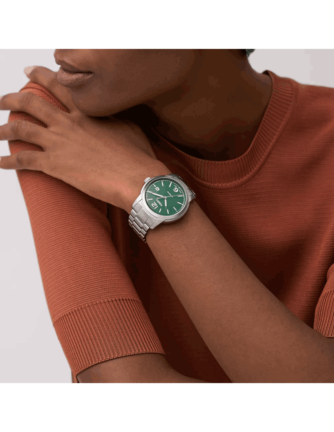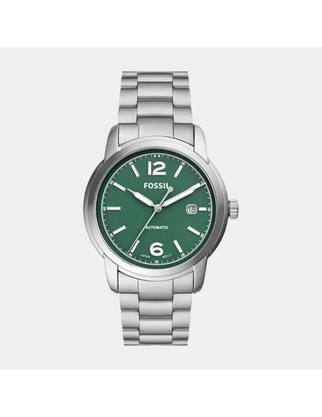 The ME3224 is a remarkable 43 mm automatic watch in Fossil’s Heritage collection. It features a striking green matte sunray dial, stainless steel case and bracelet, and an exhibition case-back, offering clear views of its Japanese-made self-winding movement.