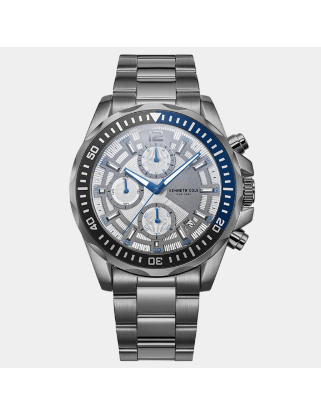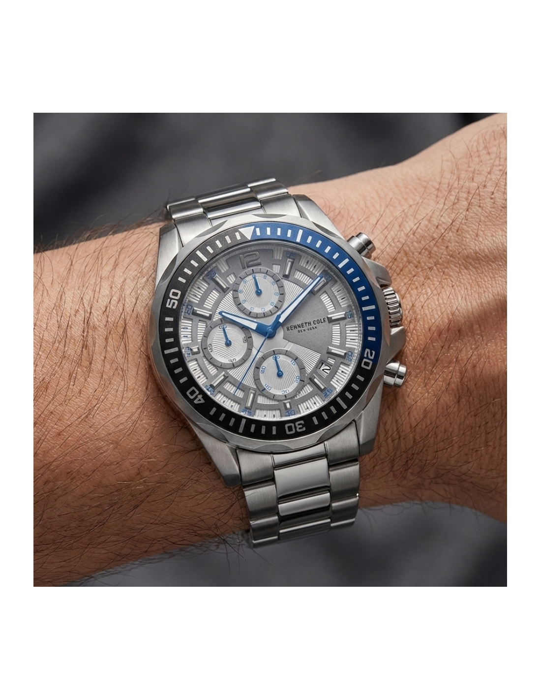 DIAL:Silver, HANDS:Hour, minute, second, sub-hands, DATE:MultifunctionWATER RESISTENT: 3 bar water resistant, MATERIAL: Stainless Steel, BAND:Stainless Steel, CRYSTAL:Mineral crystal, CASE SIZE:43mm, CASE THICKNESS:, BAND WIDTH:, FUNCTION: , CALIBER:, JEWELS: ,
