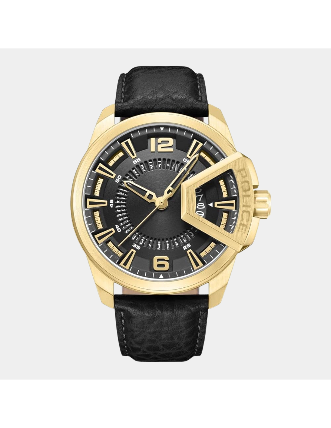 DIAL:Black, HANDS:Hour, minute, second, DATE:DateWATER RESISTENT: 5 bar water resistant, MATERIAL: Stainless Steel, BAND:Strap, CRYSTAL:Mineral crystal, CASE SIZE:46mm, CASE THICKNESS:13.6mm, BAND WIDTH:22mm, FUNCTION: , CALIBER:, JEWELS: ,
