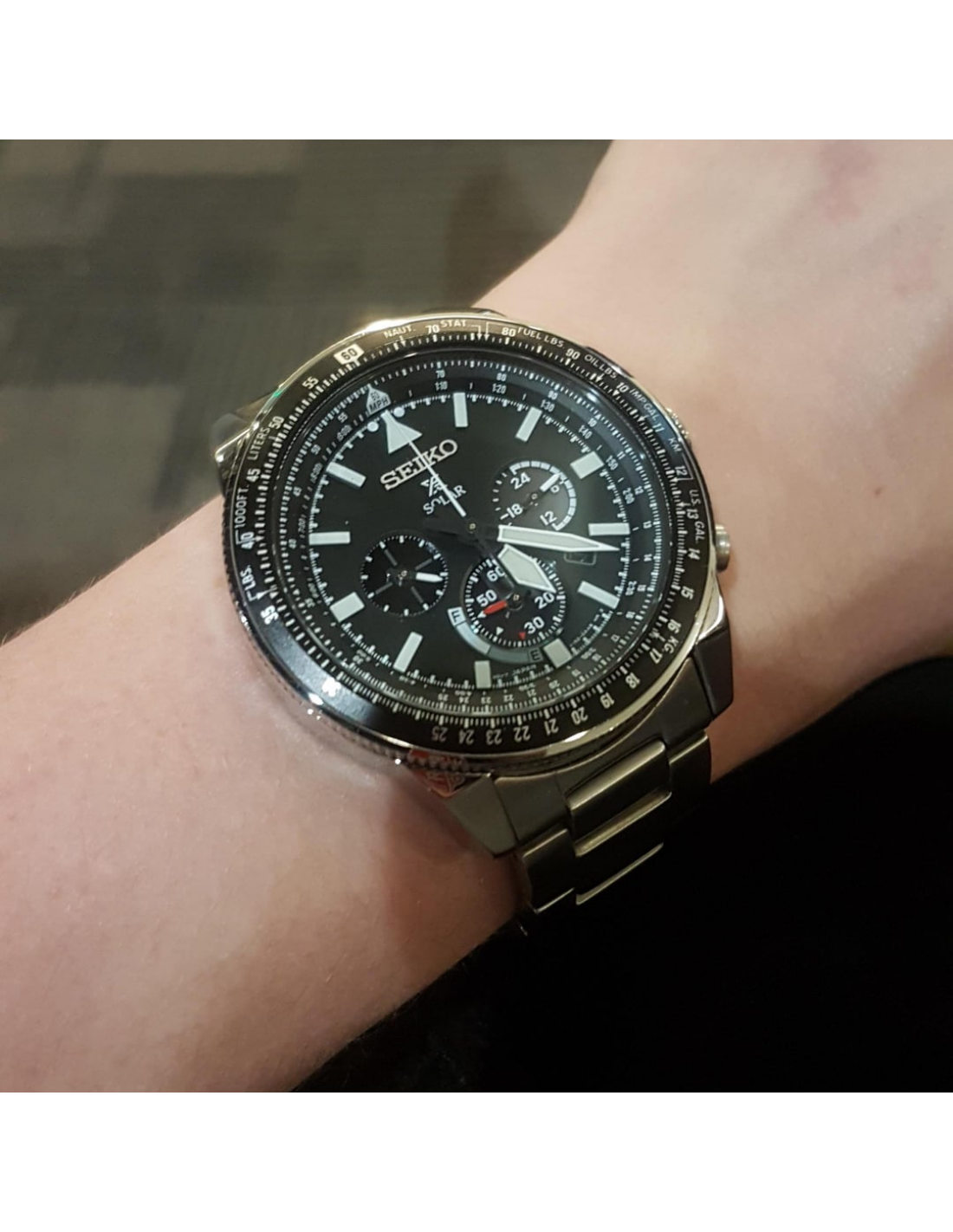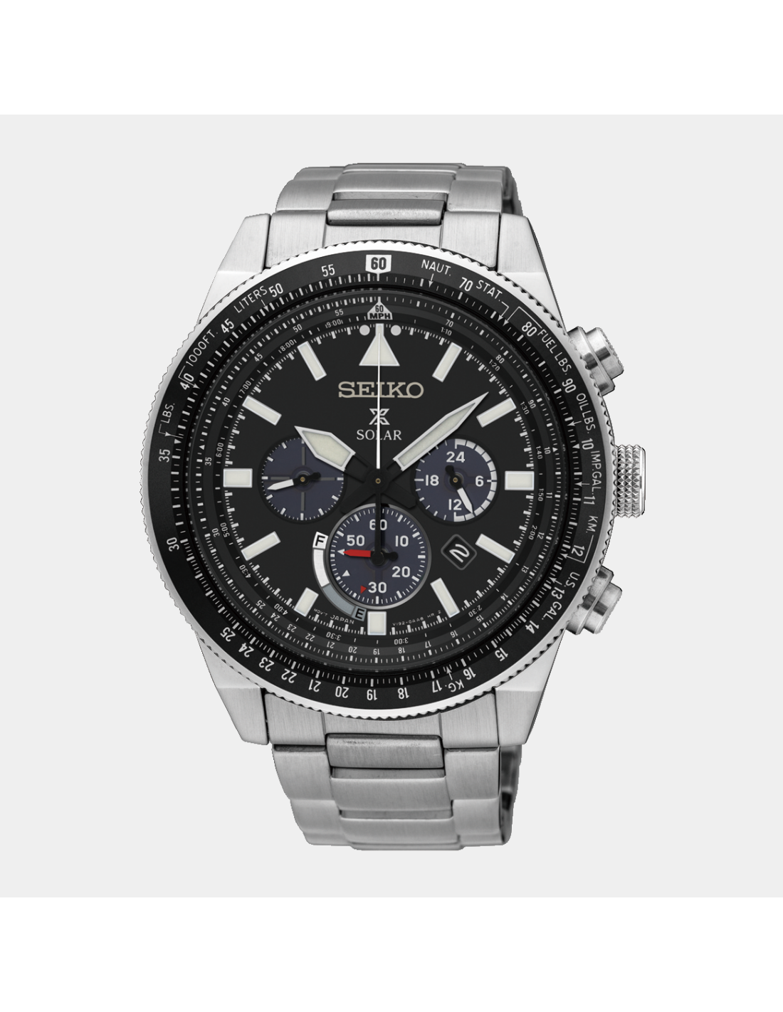 The SSC607P1 is a 45 mm solar-powered chronograph featuring a black dial with white accents, three chronograph subdials, and a rotating slide‑rule bezel for flight calculations. Equipped with Seiko’s Caliber V192 solar movement, it offers hacking seconds, a power‑reserve indicator, 24‑hour subdial, and date display. With a flat anti‑reflective sapphire crystal, 100 m water resistance, and solid stainless-steel bracelet, it weighs around 170 g and delivers reliable function with aviation-style practicality.