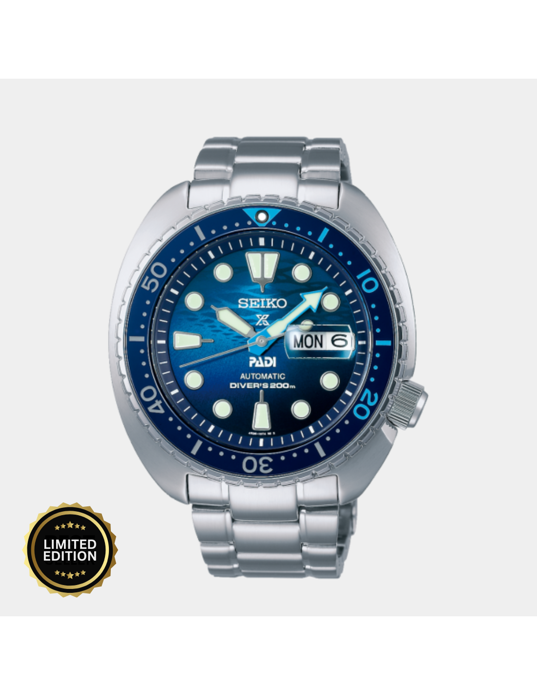 The SRPK01K1 is part of Seiko’s Prospex PADI Special Edition lineup, styled after the iconic “Turtle” diver case. With a vibrant blue dial, ceramic bezel insert, and sapphire crystal (with magnifier on date), it’s boosted for professional aquatic use: powered by automatic Caliber 4R36 (~41 hr reserve), screw-down crown/case back, 200 m water resistance, and robust build. It carries the PADI logo and is marked “SPECIAL EDITION” on the case back—designed for divers and underwater enthusiasts. It weighs in at about 198 g