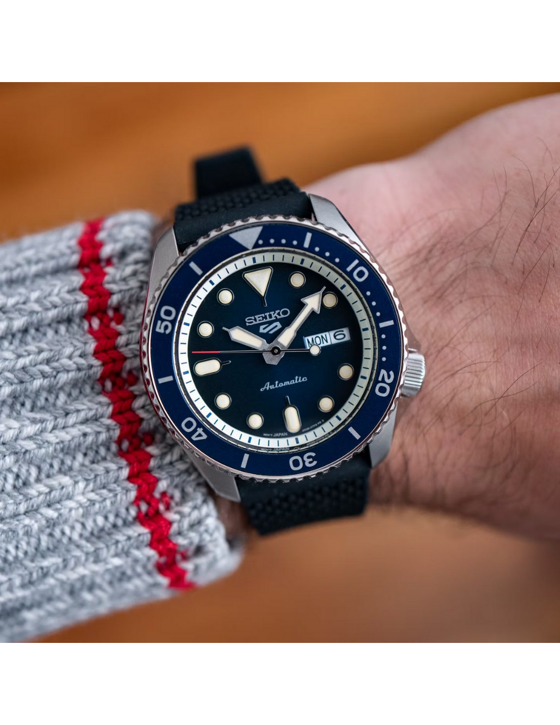 The SRPK71K1 is part of the Seiko 5 Sports U.S. Special Creation lineup. Inspired by vintage race car stripes, it features a bold black and red striped dial matched with a coordinating black‑and‑red nylon strap. With robust styling, a unidirectional bezel, and a distinctive red seconds hand, the watch offers standout design and sporty character. Powered by Caliber 4R36 (automatic movement with manual winding and hacking), it includes day/date display, 100 m water resistance, and an exhibition screw‑down case back. Ideal for those who want heritage-style racing aesthetics in a durable mechanical watch.