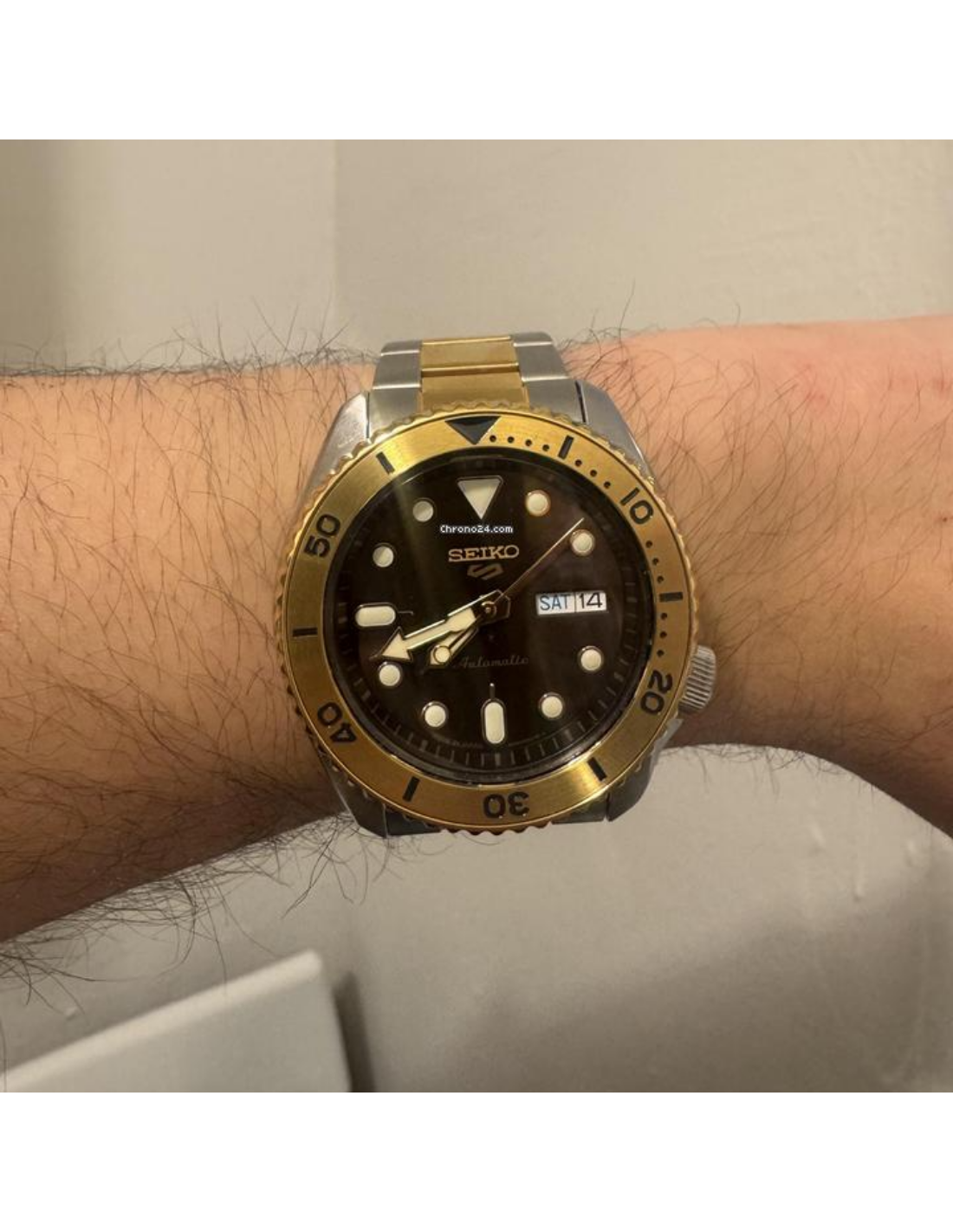 The WSRPK24K1 is part of Seiko’s U.S. Special Creation line—an all-gold-toned variant styled after the iconic SKX diver look. It sports a 42.5 mm stainless steel case with gold-color coating, a matching bezel, and a sun-brushed brown dial with gold-accented markers. Powered by the reliable 4R36 automatic movement (~41-hour power reserve) and offering 100 m water resistance, it combines vintage-inspired aesthetics with modern mechanical reliability for a refined sporty look