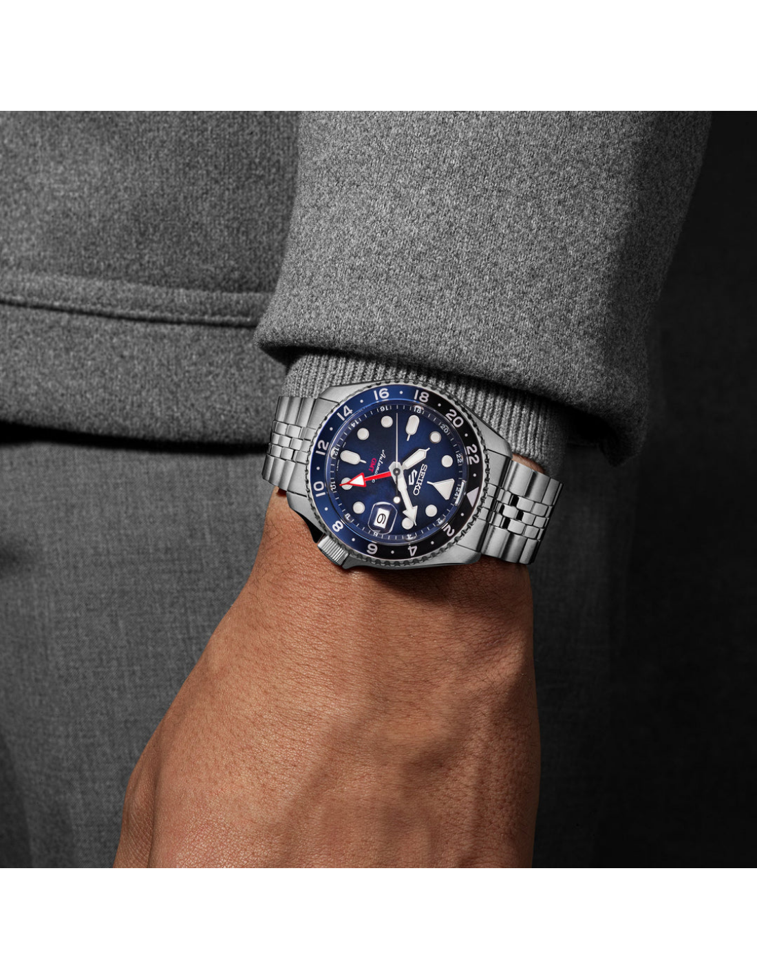 A bold 42.5 mm automatic GMT watch featuring a deep blue sunburst dial and bi‑color blue and black 24-hour bezel. With its independent GMT hand, it allows tracking of a second time zone. The watch uses Seiko’s reliable 4R34 automatic movement (~41 hr power reserve), offers 100 m water resistance, a Hardlex crystal with cyclops date magnifier, and a five-link “Jubilee”-style bracelet. Designed for travelers seeking robust and affordable GMT functionality with vintage-inspired Seiko style.