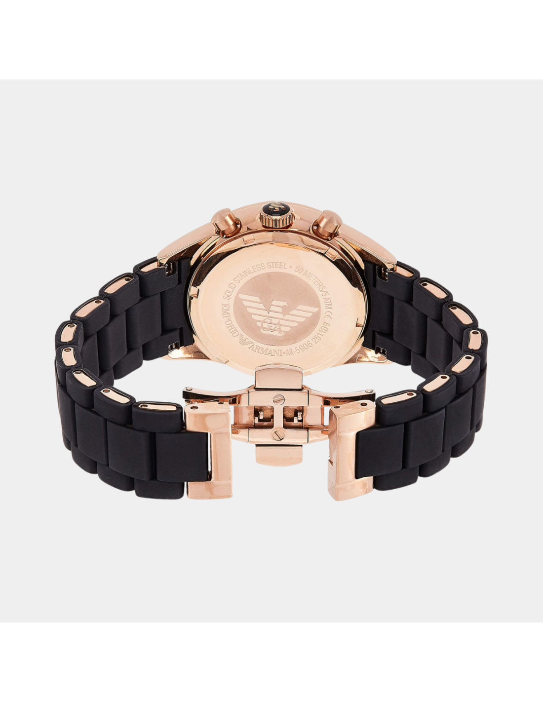 The Emporio Armani AR5906 is a sporty men’s chronograph featuring a 43 mm black ion-plated stainless steel case, a bold black dial with rose gold-tone details, and a durable black silicone strap. With its precise quartz chronograph movement and modern, masculine look, it’s perfect for casual and athletic wear.