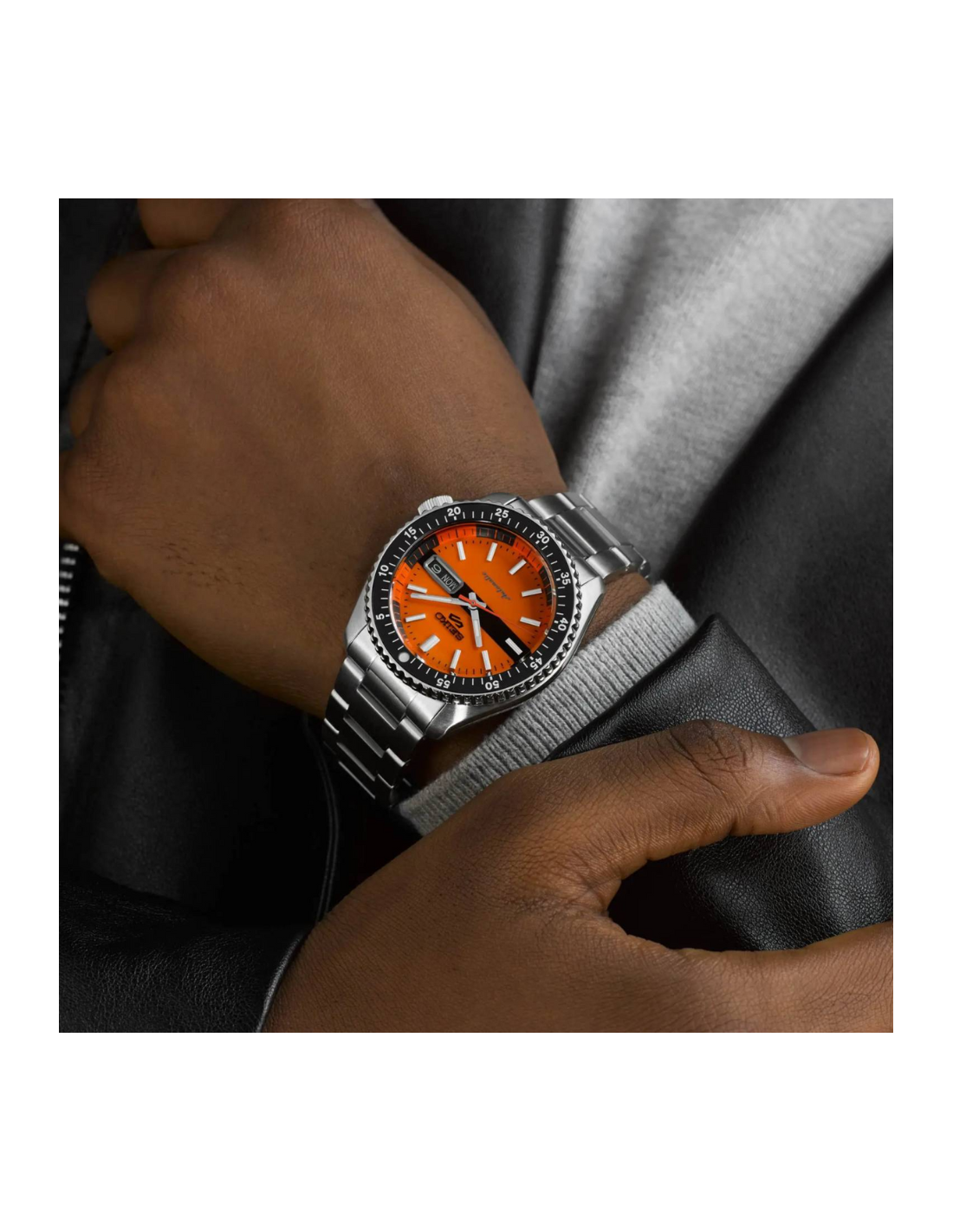 The Seiko SRPK11K1 is a vibrant and sporty automatic watch from the Seiko 5 Sports “SKX Style” collection, combining classic dive-inspired design with modern reliability. It features a 42.5 mm stainless steel case with a bold orange dial, luminous hands and markers, and a unidirectional rotating bezel that enhances its adventurous character. Powered by Seiko’s dependable Caliber 4R36 automatic movement, it offers both self-winding and manual winding options, a day-date display, and approximately 41 hours of power reserve. The watch is protected by a curved Hardlex crystal and showcases its mechanical heart through a transparent screw caseback engraved with “Special Edition.” With 100 meters of water resistance and a solid stainless steel bracelet secured by a three-fold clasp, the SRPK11K1 is both durable and versatile, perfect for daily wear or outdoor activity.