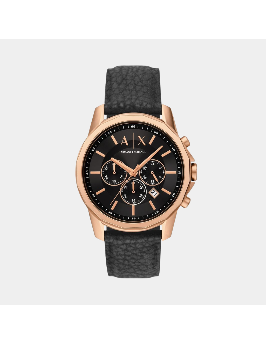 The Armani Exchange AX1769 is a bold men’s chronograph wristwatch that blends sporty style with everyday practicality. It features a 44 mm round stainless steel case with a striking black sunray dial contrasted by a warm rose‑gold tone finish, giving it a modern yet refined look. The dial houses three chronograph sub‑dials and a date display, all powered by reliable quartz movement for accurate timekeeping. A comfortable black rubber strap with a secure prong buckle completes the design, while mineral crystal offers durable protection. With water resistance up to 50 meters (5 ATM), the AX1769 handles daily wear and light water exposure. This timepiece is ideal for men seeking a stylish, functional watch that transitions seamlessly from casual days to active evenings.