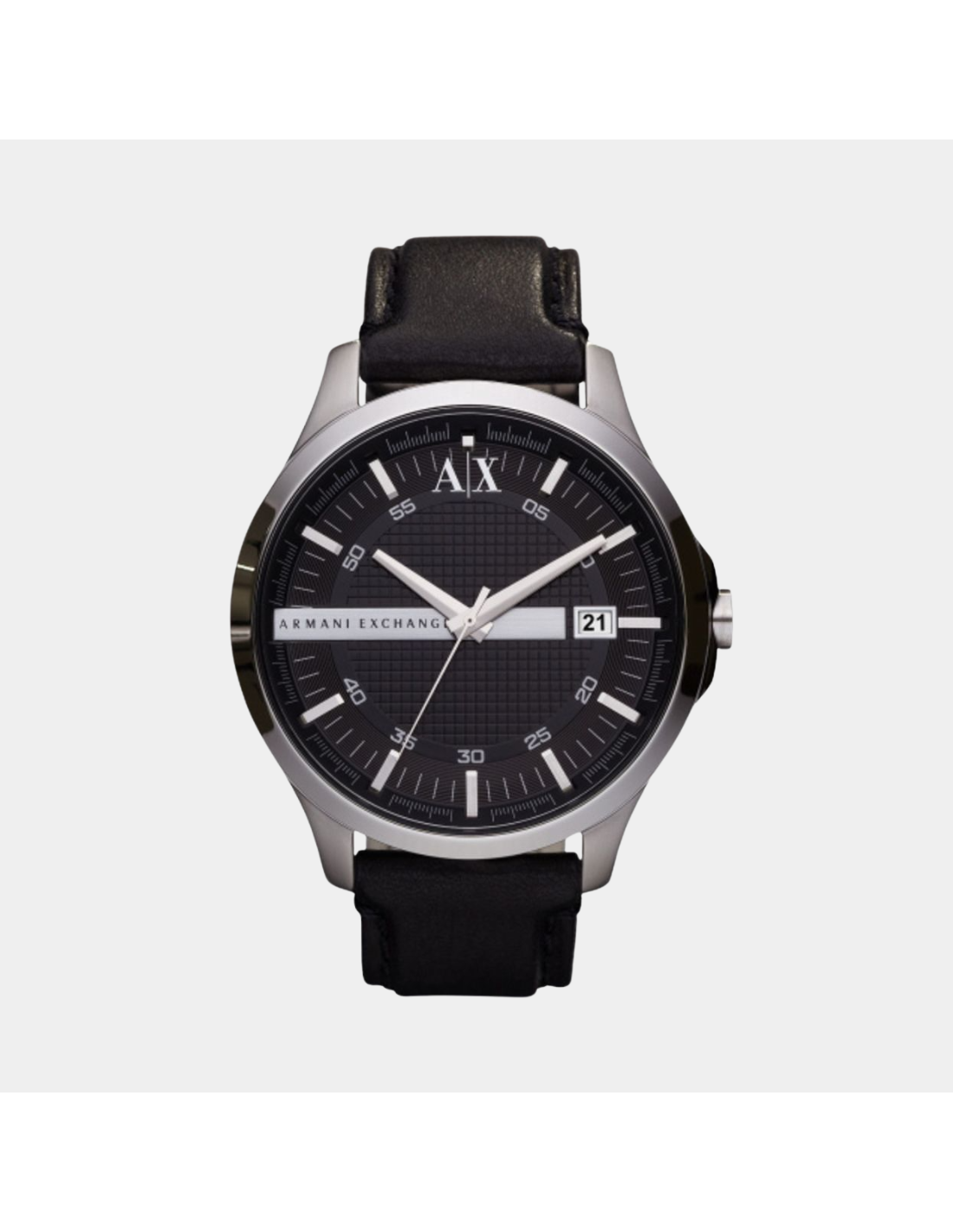The Armani Exchange AX2101 is a sleek and stylish men’s analog watch that blends classic design with everyday practicality. It features a 46 mm stainless steel round case paired with a black leather strap and traditional buckle for a timeless look that suits both casual and dressy outfits. The black dial displays silver‑tone hands, index markers, and a date window at 3 o’clock, all powered by reliable quartz movement for accurate timekeeping. Protected by a mineral crystal, the watch is water‑resistant up to 50 meters (5 ATM), making it suitable for everyday wear and light water exposure. With its clean design and comfortable fit, the AX2101 embodies Armani Exchange’s modern yet understated aesthetic